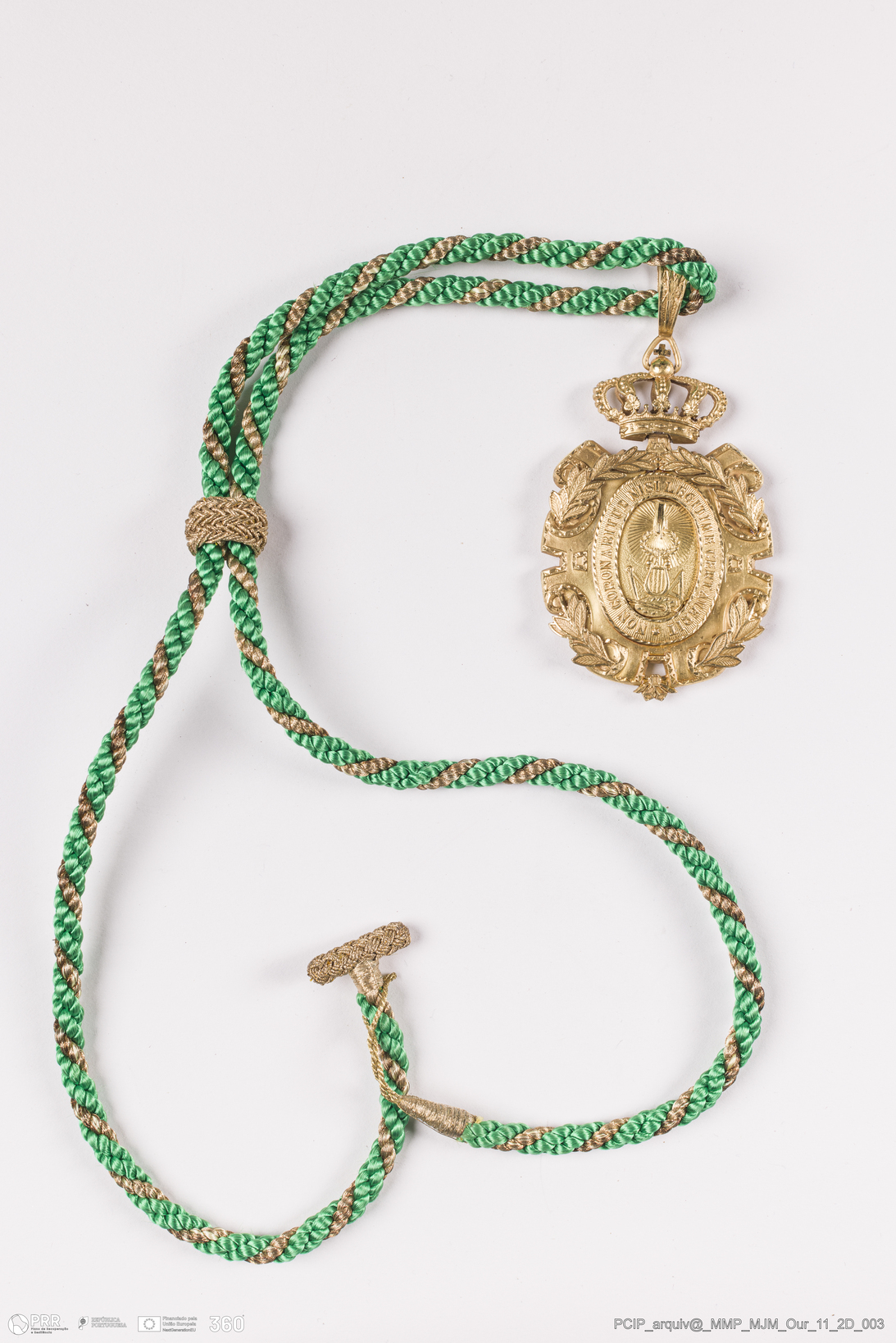 Matéria/Técnica: Ouro e seda; Cronologia: 1956; Autoria: Villanueva Y Laiseca; Dimensões: 9 x 4,5 cm.