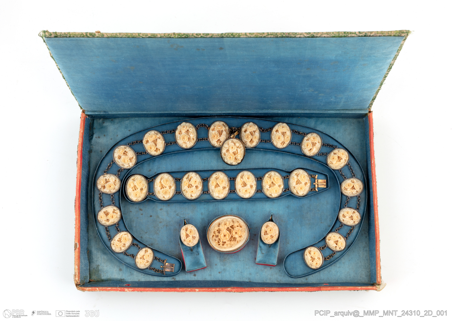 Matéria/Técnica: Marfim; metal dourado.; Cronologia: Romântico; Autoria: Desconhecida; Dimensões (cm): Altura: Colar: 50,2; Brincos: 3,2; (espigão): 3,3; Largura: Colar: 7,2; Pulseira: 3; Alf: 3,6; Brinco: 1,9; Comprimento: Pulseira: 20,7; Alf: 4.
