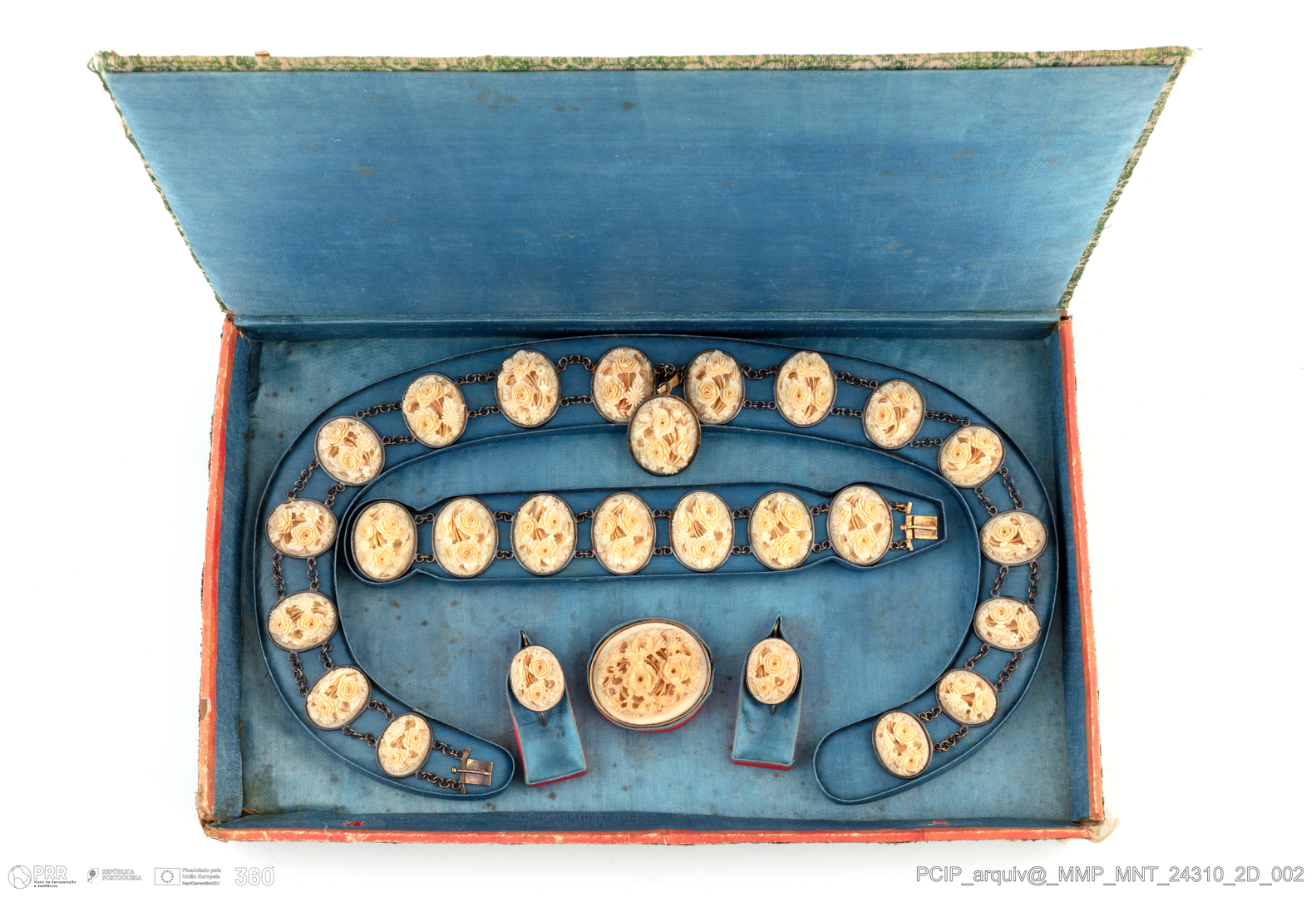 Matéria/Técnica: Marfim; metal dourado.; Cronologia: Romântico; Autoria: Desconhecida; Dimensões (cm): Altura: Colar: 50,2; Brincos: 3,2; (espigão): 3,3; Largura: Colar: 7,2; Pulseira: 3; Alf: 3,6; Brinco: 1,9; Comprimento: Pulseira: 20,7; Alf: 4.