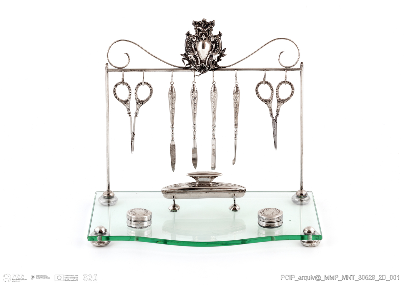 Matéria/Técnica: Prata; vidro; metal; pelica branca.; Cronologia: Início do século XX; Autoria: Desconhecida; Dimensões (cm): Altura: 27,5; Largura: Base: 19; Comprimento: Base: 31,5.