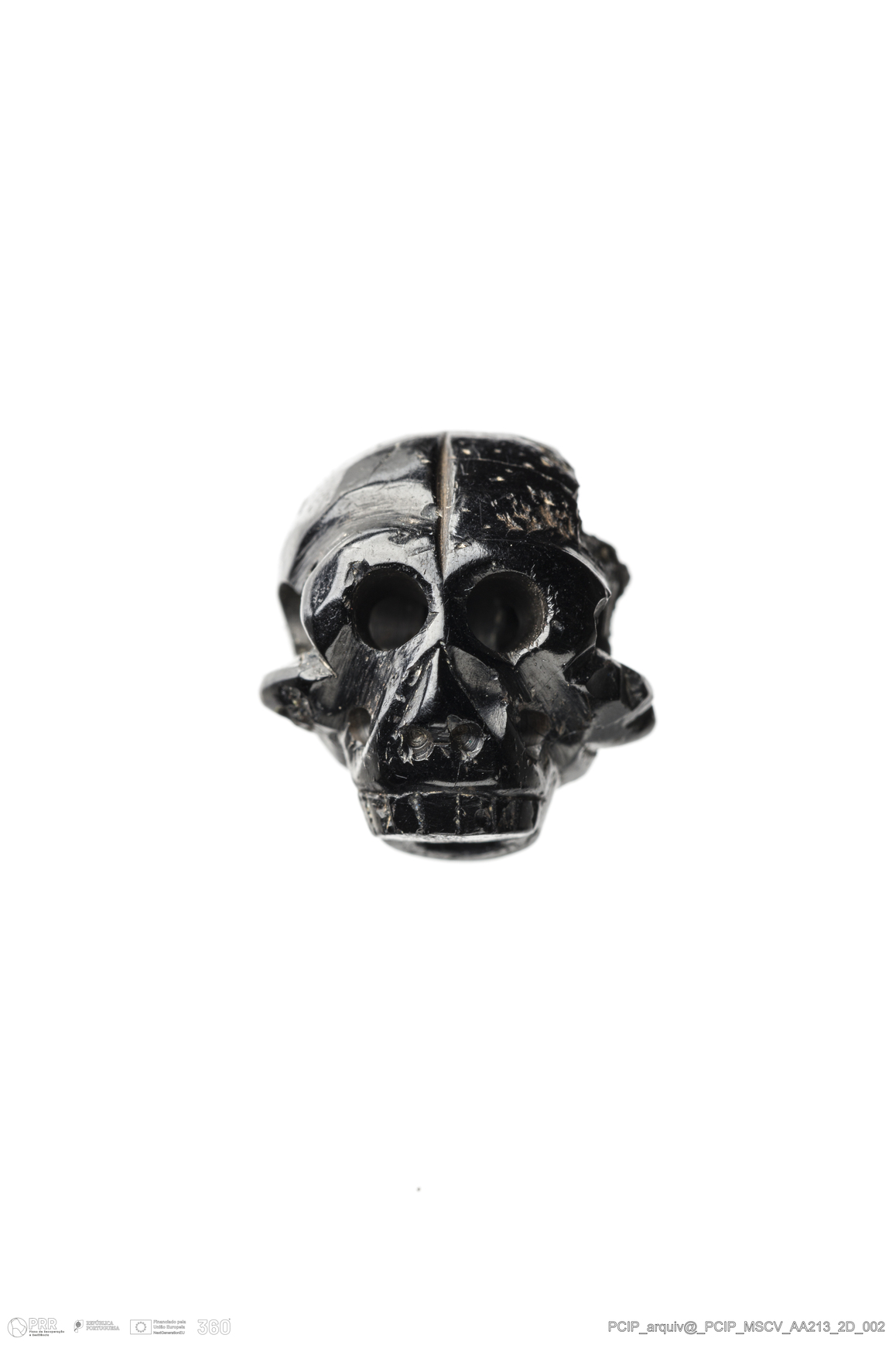 Matéria/Técnica: Azeviche; Cronologia: Século XVI -XVII; Autoria: Desconhecida; Dimensões: Altura: 15mm; Largura: 14mm; Espessura: 15,5mm.