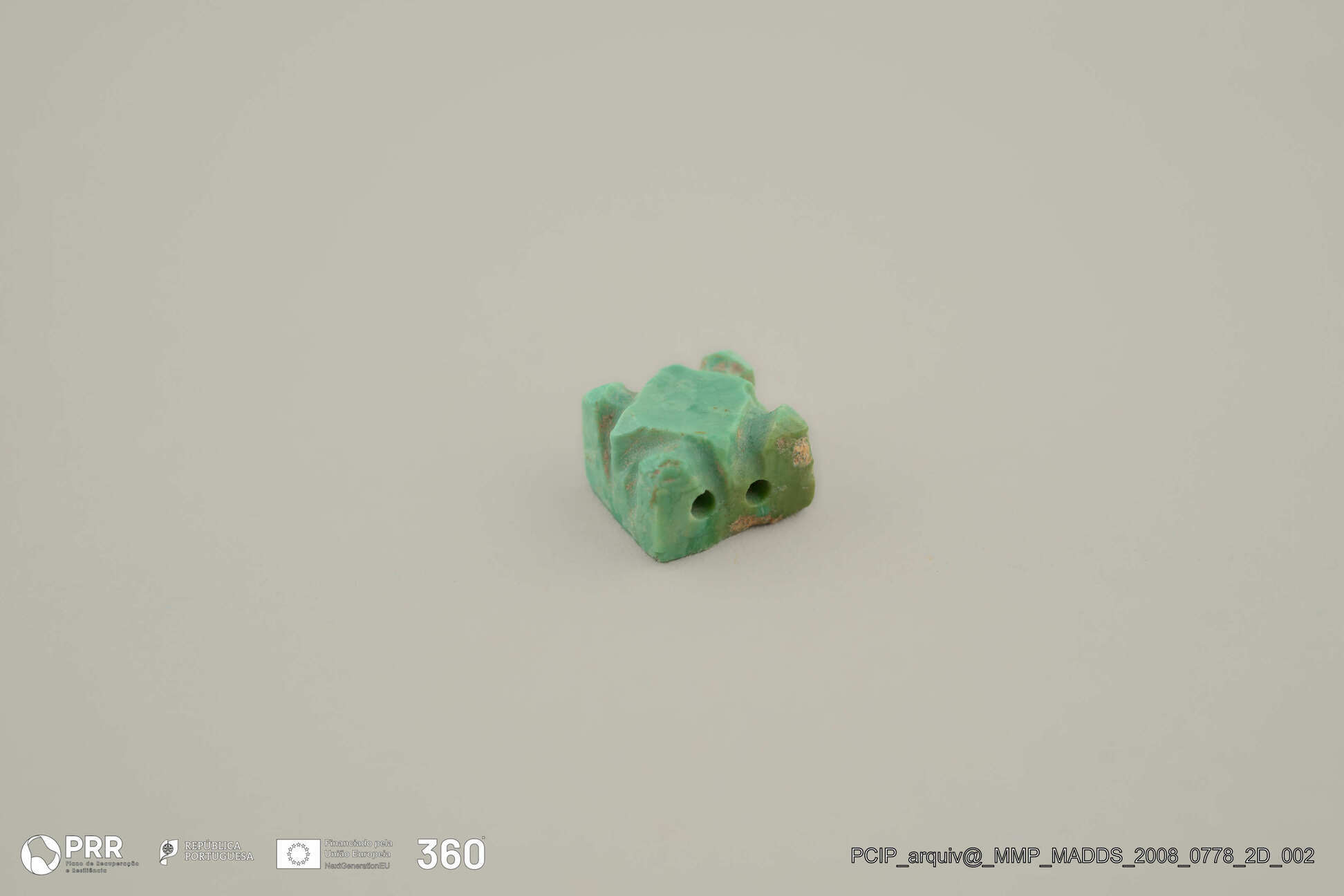 Matéria/Técnica: Variscite; Cronologia: Romano; Autoria: Desconhecida; Dimensões (cm): 0,6 x 0,4 x 0,2.