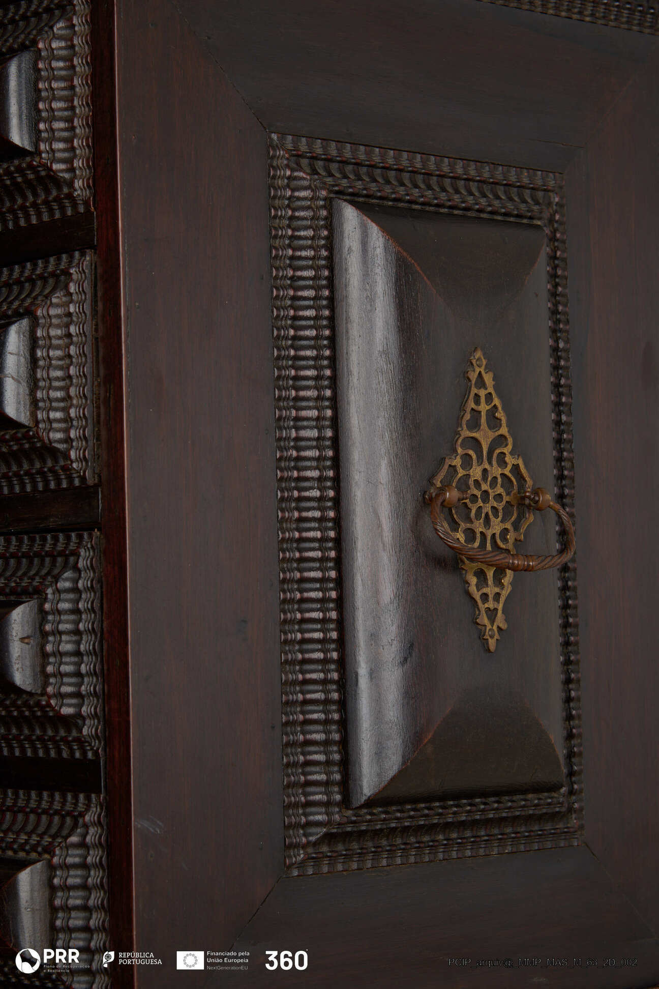 Matéria/Técnica: Madeira entalhada e torneada; molduras de tremidos; a madeira foi escurecida com vieux chêne; Cronologia: Século XVIII; Autoria: Desconhecida; Dimensões: Altura: 154 cm x Largura: 42,7 cm x Comprimento: 105 cm.