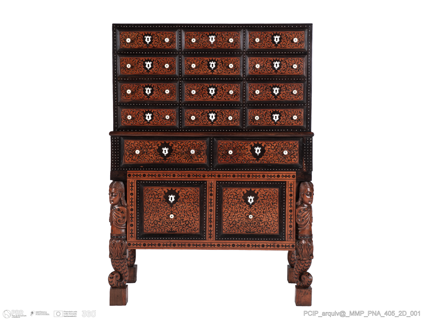 Matéria/Técnica: Teca, ébano, marfim, latão; Cronologia: Século XVII; Autoria: Desconhecida; Dimensões (cm): Altura: 120; Largura: 88; Profundidade: 47; Corpo central 16X87X47 Corpo inferior 57X87X47.