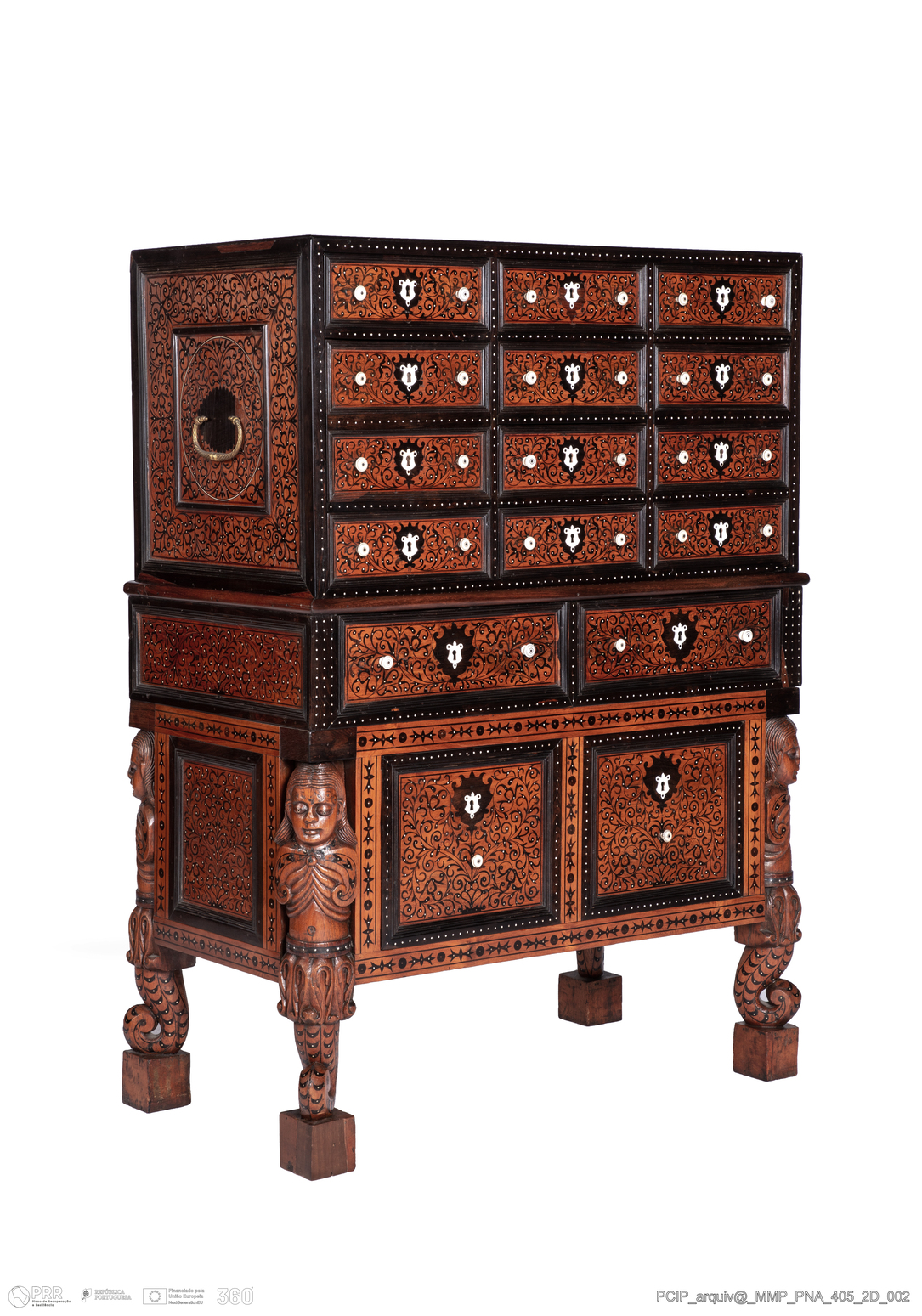 Matéria/Técnica: Teca, ébano, marfim, latão; Cronologia: Século XVII; Autoria: Desconhecida; Dimensões (cm): Altura: 120; Largura: 88; Profundidade: 47; Corpo central 16X87X47 Corpo inferior 57X87X47.