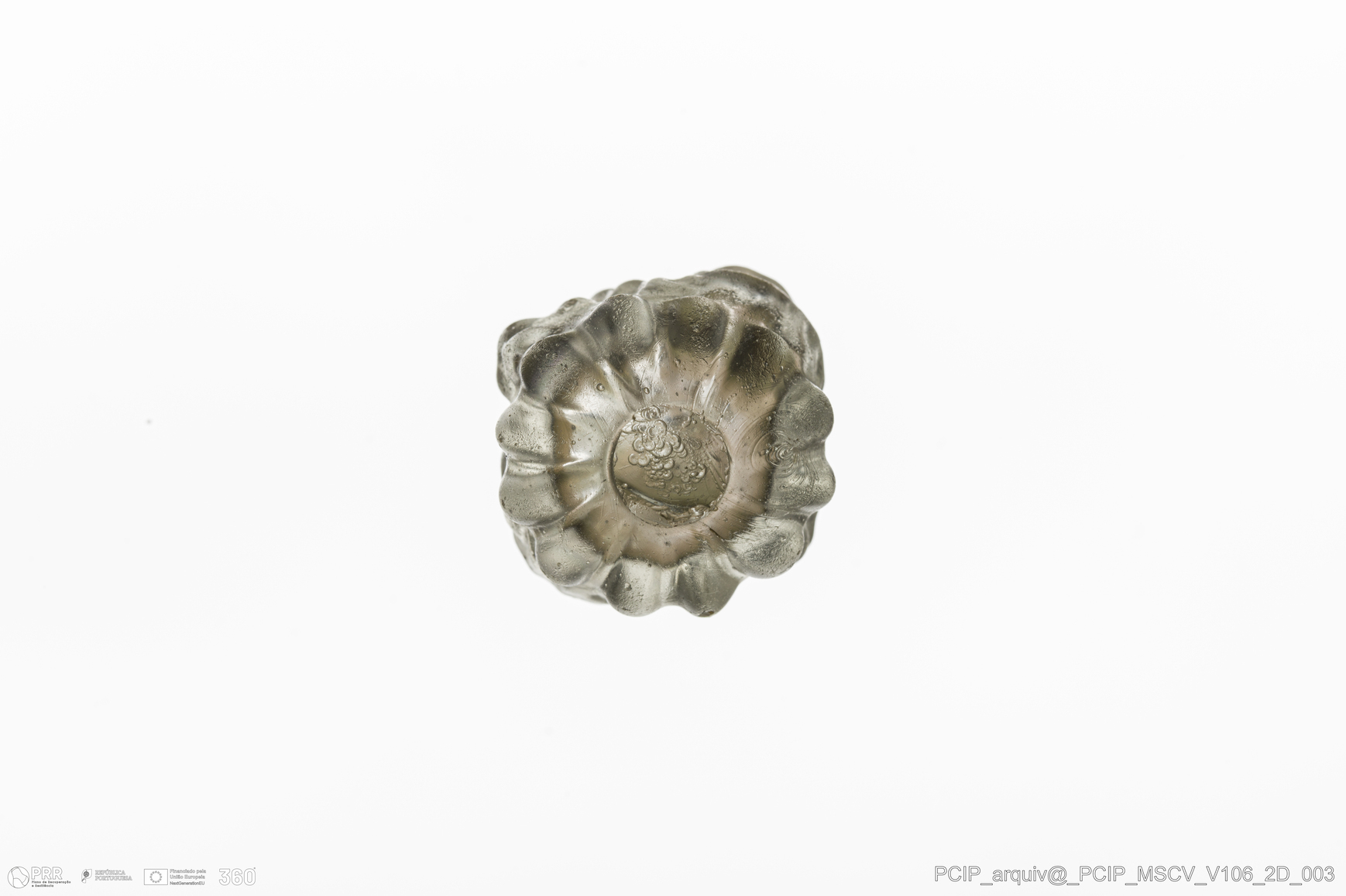 Matéria/Técnica: Vidro; Cronologia: Século XVII; Autoria: Desconhecida; Dimensões: Altura: 39mm; Largura: 23mm.