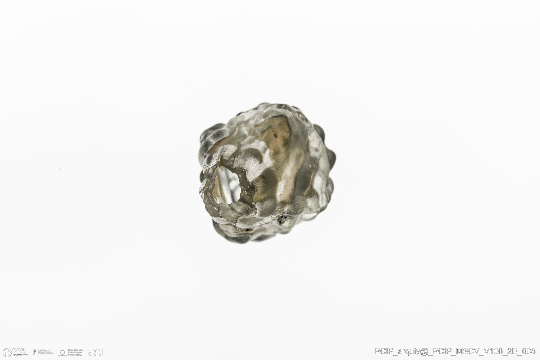 Matéria/Técnica: Vidro; Cronologia: Século XVII; Autoria: Desconhecida; Dimensões: Altura: 39mm; Largura: 23mm.