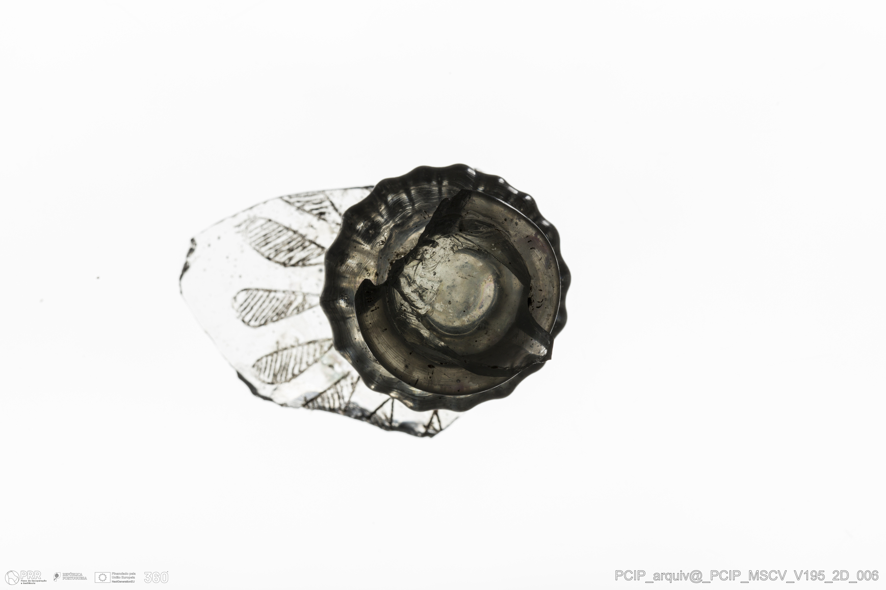 Matéria/Técnica: Vidro; Cronologia: Século XVII; Autoria: Desconhecida; Dimensões: Largura: 45mm; Altura: 50mm.