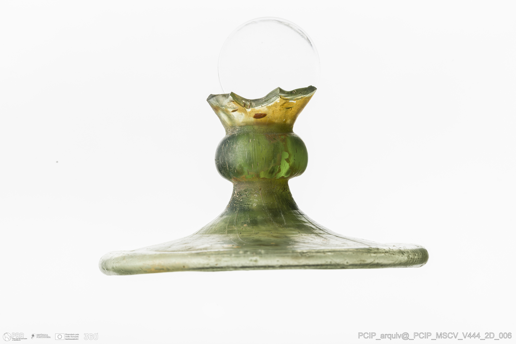 Matéria/Técnica: Vidro; Cronologia: Século XVII; Autoria: Desconhecida; Dimensões: Comprimento: 64mm; Largura: 30mm.