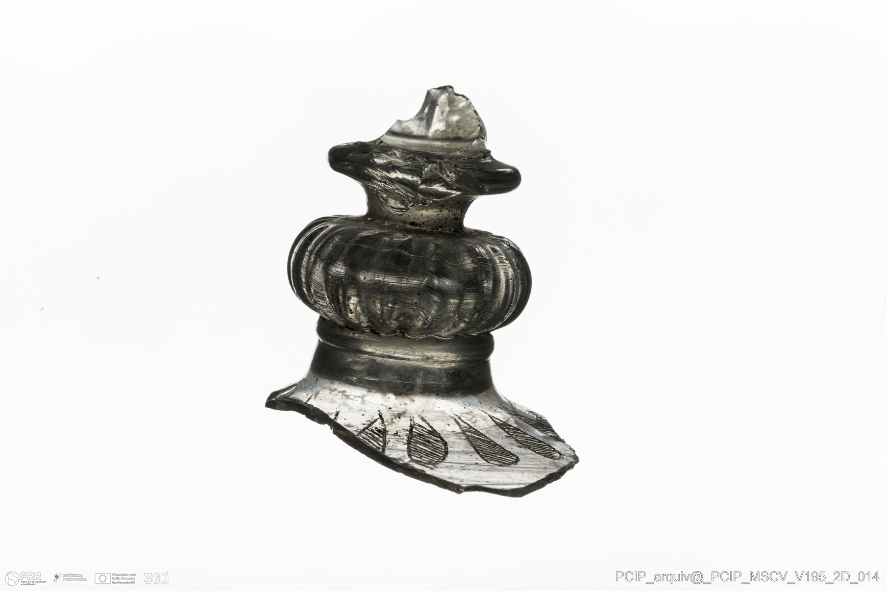 Matéria/Técnica: Vidro; Cronologia: Século XVII; Autoria: Desconhecida; Dimensões: Largura: 45mm; Altura: 50mm.