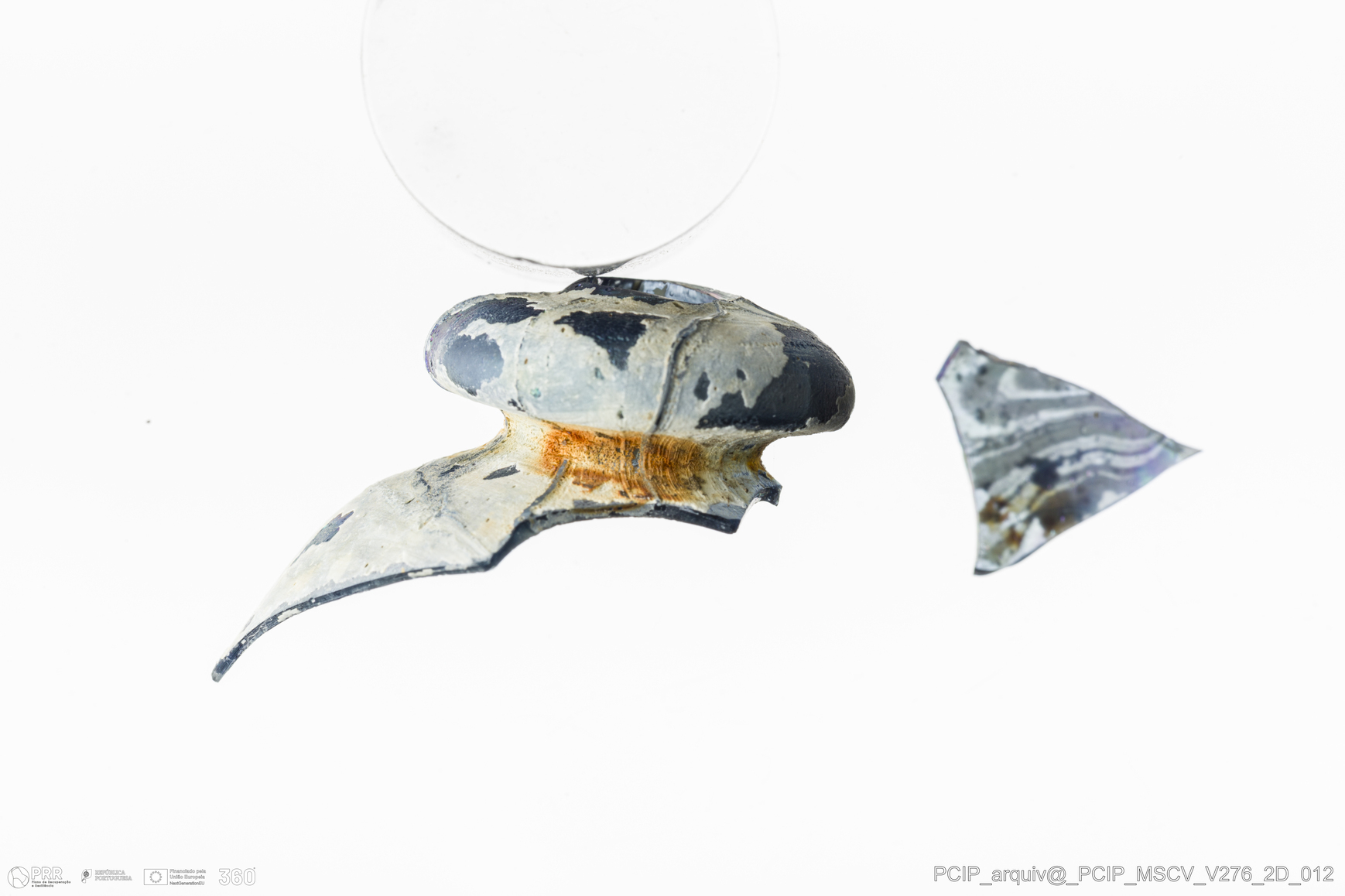 Matéria/Técnica: Vidro; Cronologia: Século XVII; Autoria: Desconhecida; Dimensões: Largura: 23mm; Altura: 26mm.