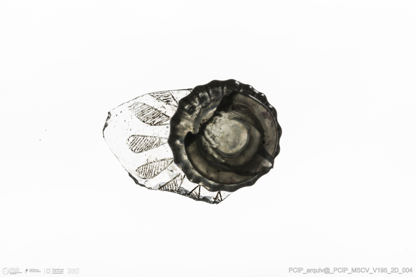 Matéria/Técnica: Vidro; Cronologia: Século XVII; Autoria: Desconhecida; Dimensões: Largura: 45mm; Altura: 50mm.