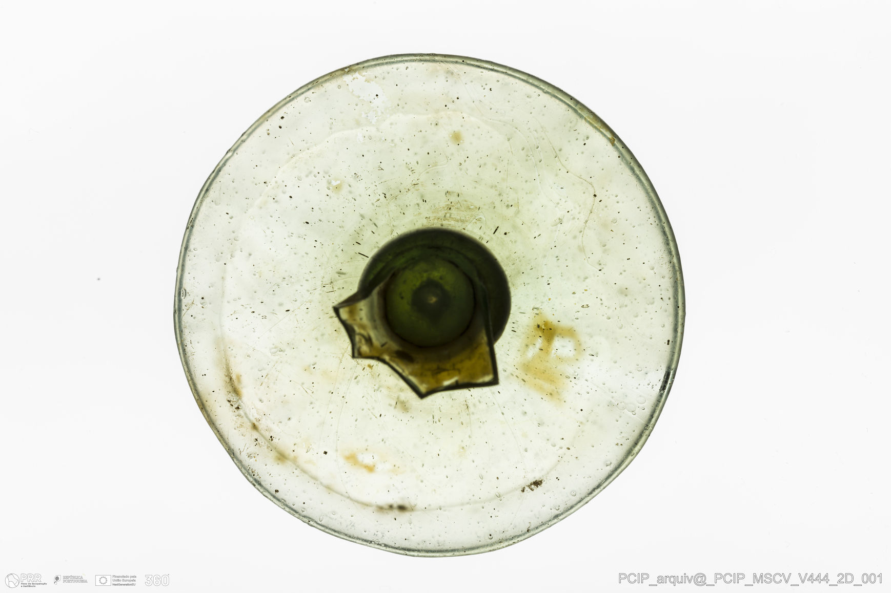 Matéria/Técnica: Vidro; Cronologia: Século XVII; Autoria: Desconhecida; Dimensões: Comprimento: 64mm; Largura: 30mm.
