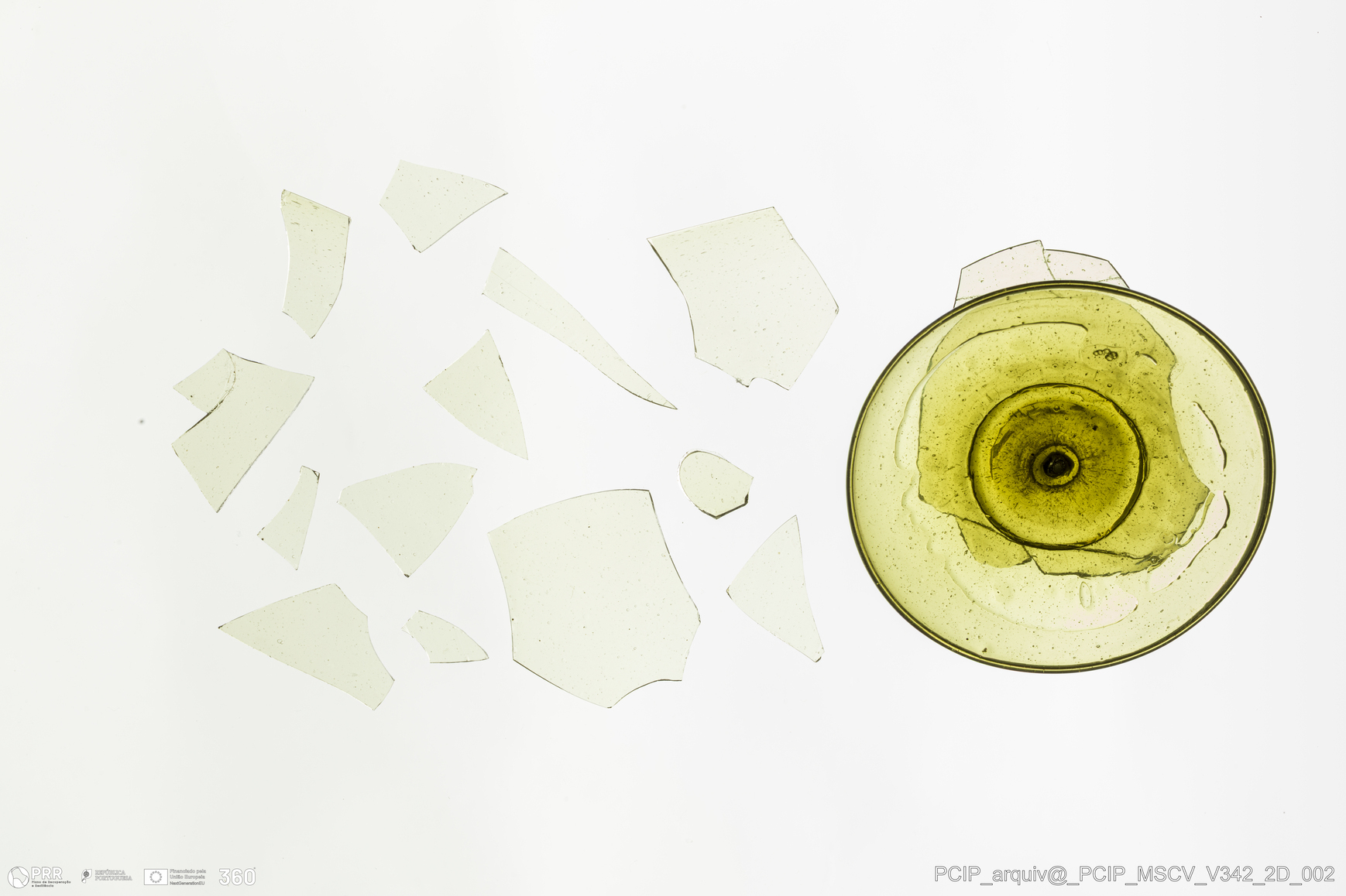 Matéria/Técnica: Vidro; Cronologia: Século XVII; Autoria: Desconhecida; Dimensões: Diâmetro Bordo: 120mm; Diâmetro base: 75mm; Altura: 128mm.
