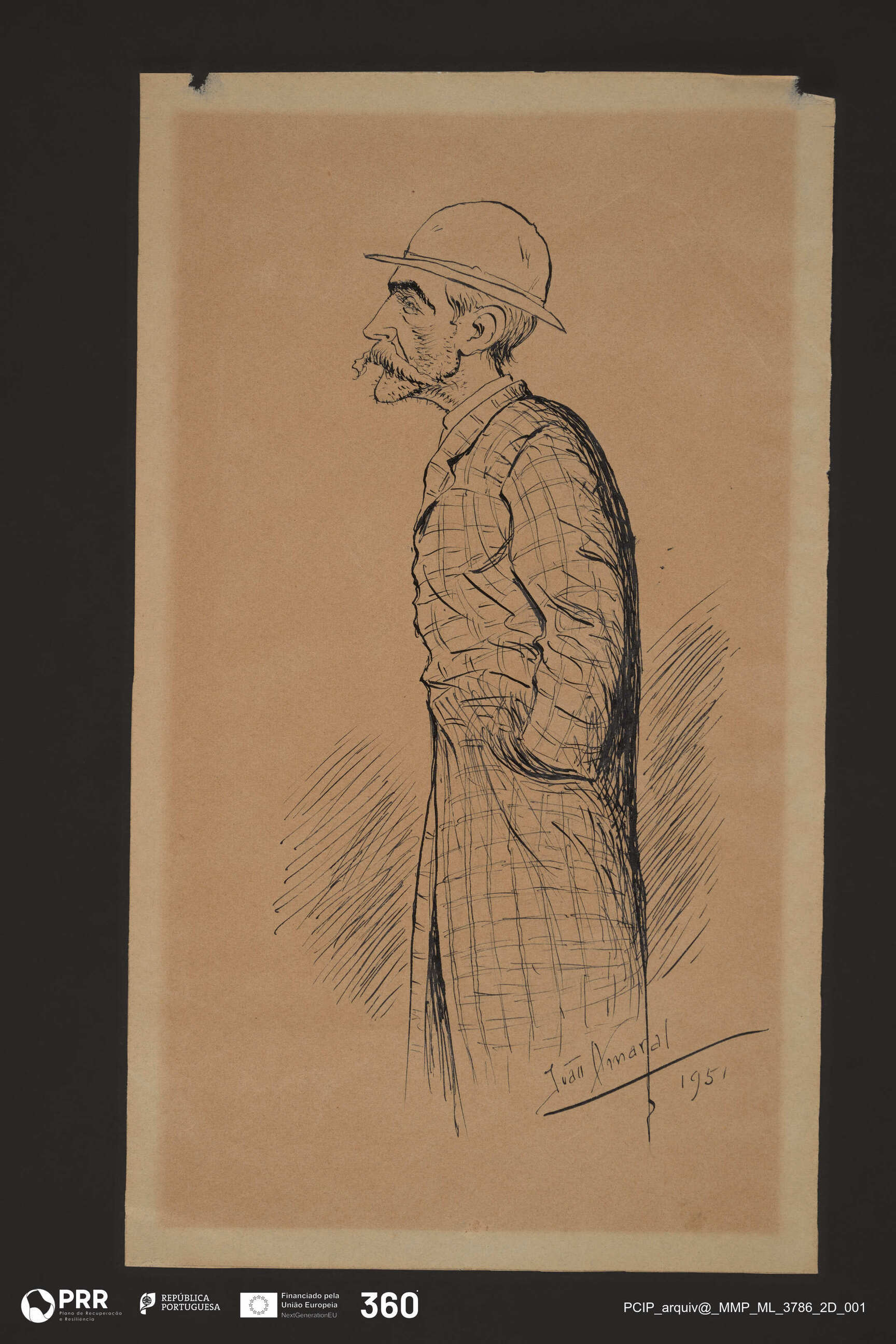 Matéria/Técnica: Desenho à pena; Cronologia: 1951; Autoria: Amaral, João (1874 - 1955); Dimensões (cm): Altura: 25,5 x Largura: 14,8.