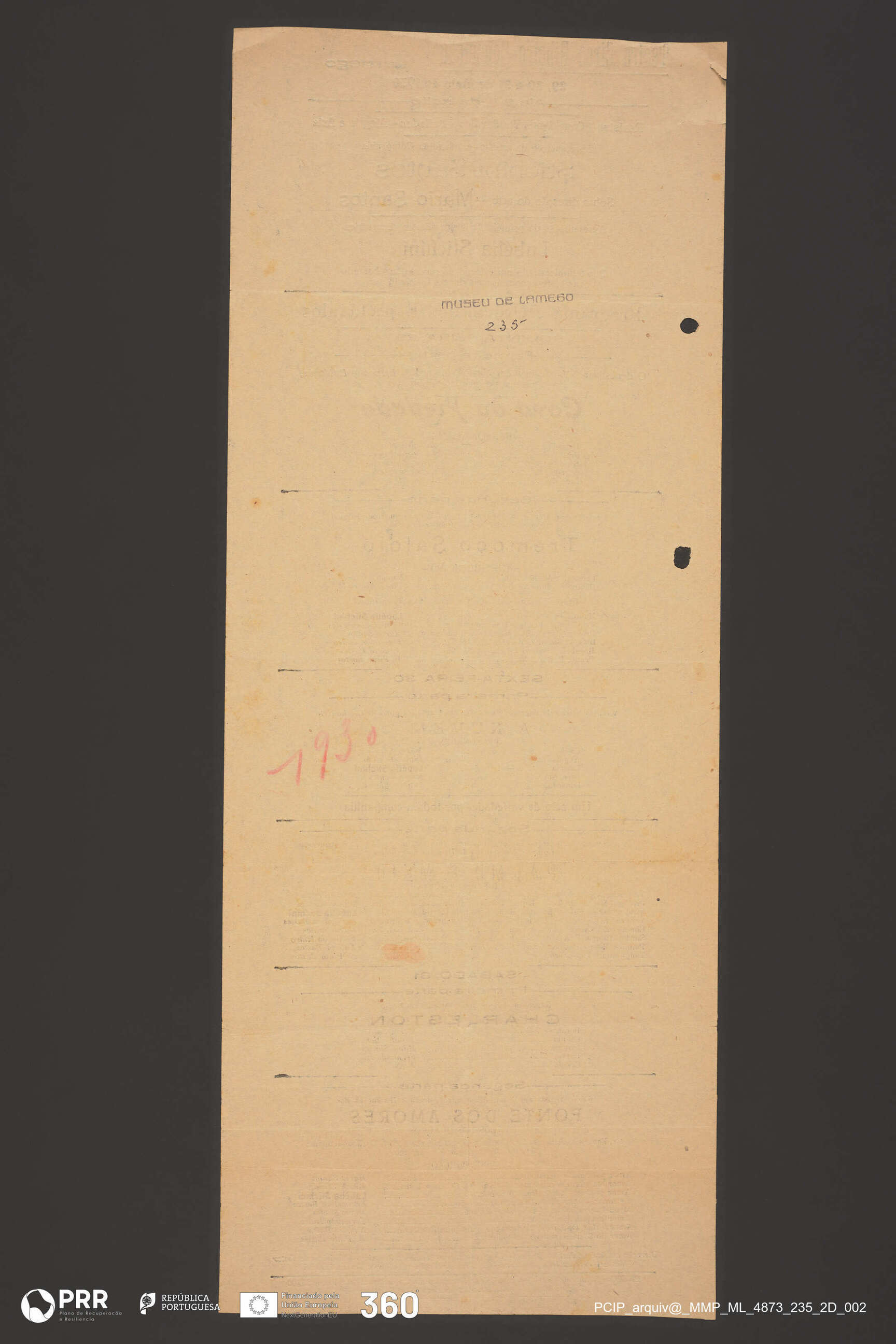 Matéria/Técnica: Impressão; Cronologia: 1930; Autoria: Desconhecida; Dimensões (cm): Altura: 44,8 x Comprimento: 17,3.