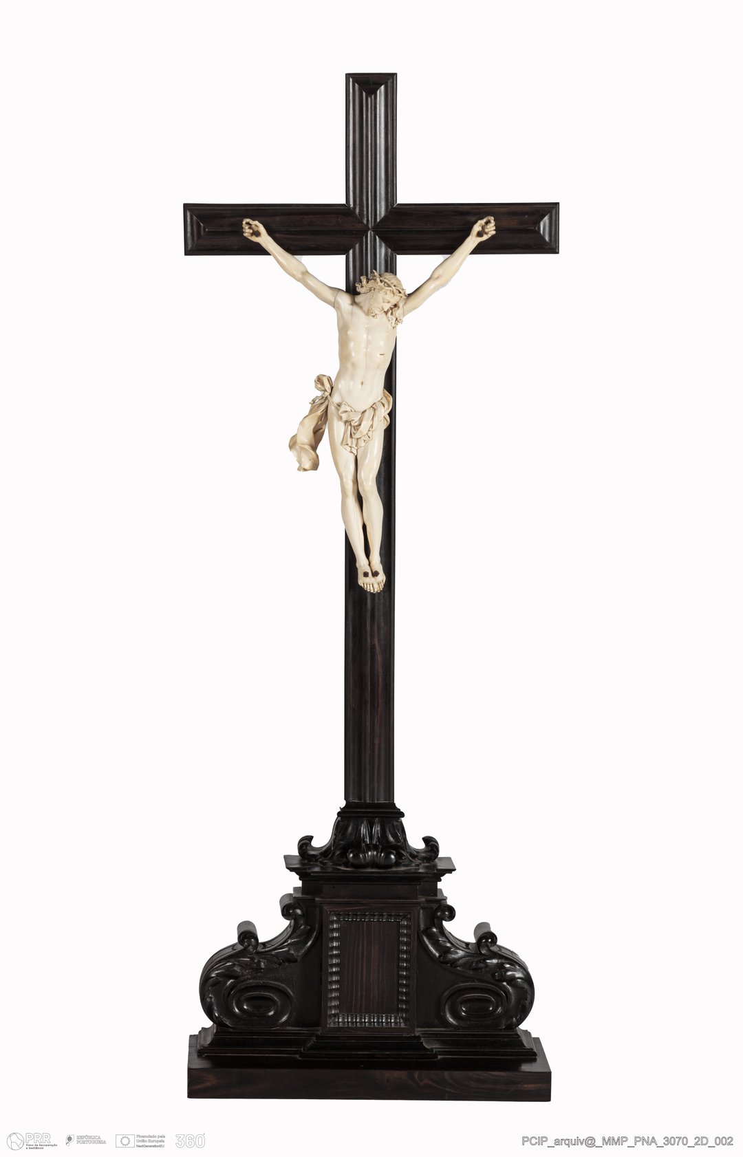 Matéria/Técnica: Marfim, pau preto; Cronologia: Século XIX; Autoria: Desconhecida; Dimensões (cm): Altura: 101; Largura: 35,5; Profundidade: 12.