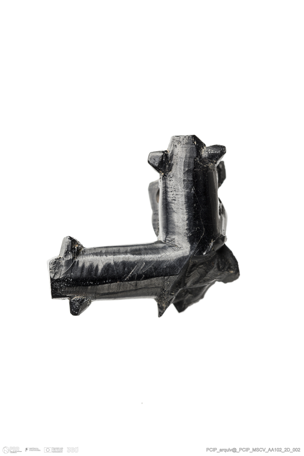 Matéria/Técnica: Azeviche; Cronologia: Século XVI-XVII; Autoria: Desconhecida; Dimensões: Largura: 29mm Altura / Espessura: 10mm Comprimento / Profundidade: 23mm.