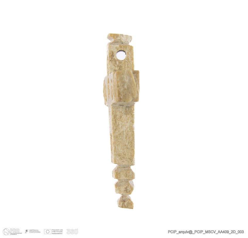 Matéria/Técnica: Osso; Cronologia: Século XVI-Século XVII; Autoria: Desconhecida; Dimensões: Comprimento: 26,5mm; Largura: 23mm; Espessura: 4mm.