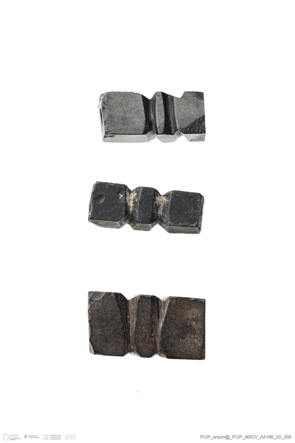 Matéria/Técnica: Azeviche; Cronologia: Século XVI- XVII; Autoria: Desconhecida; Dimensões: Comprimento: 13mm; Largura: 6mm; Espessura: 7mm.