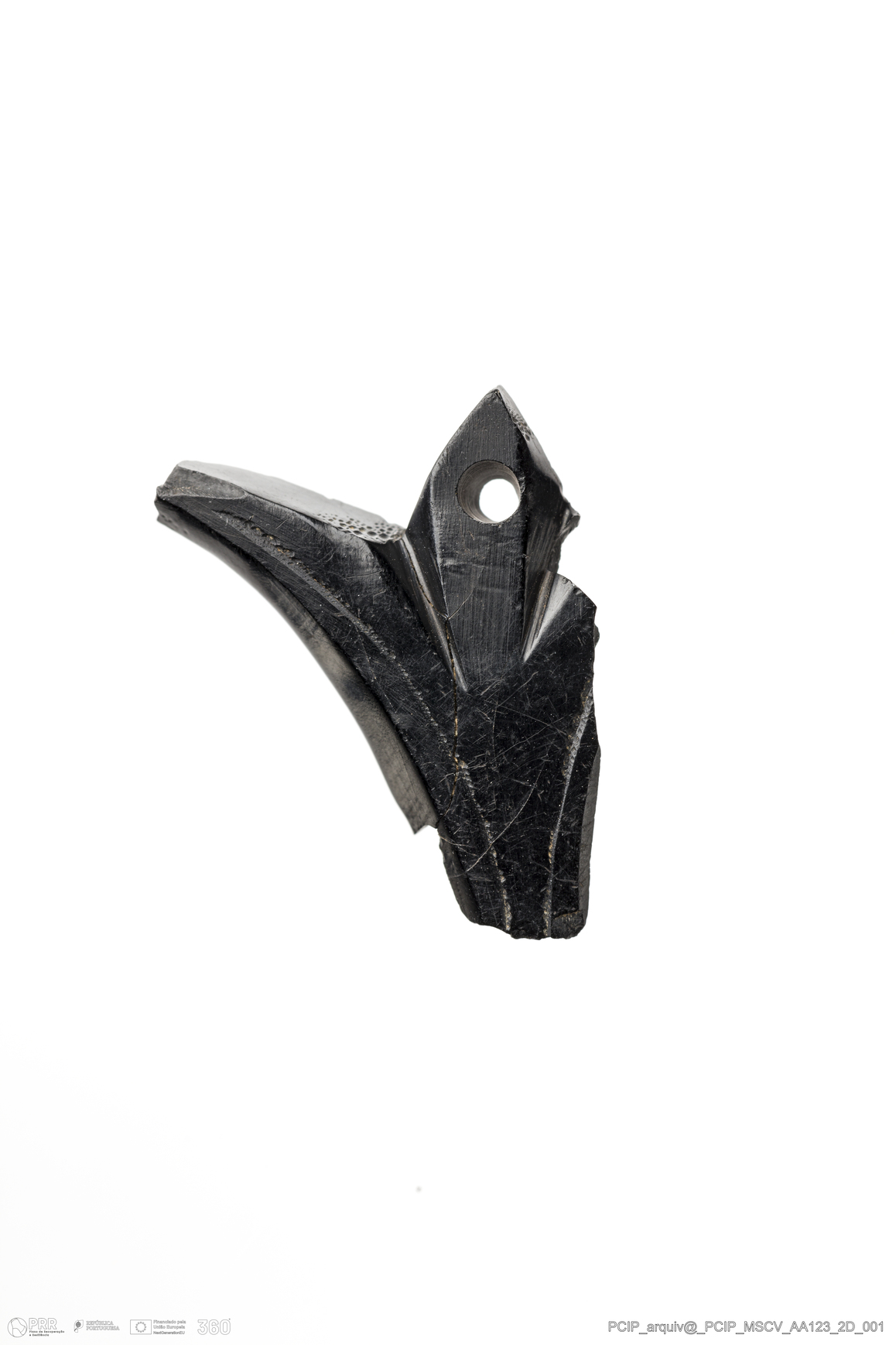 Matéria/Técnica: Azeviche; Cronologia: Século XVI- XVII; Autoria: Desconhecida; Dimensões: Comprimento: 25mm; Largura: 20mm; Espessura: 5mm.
