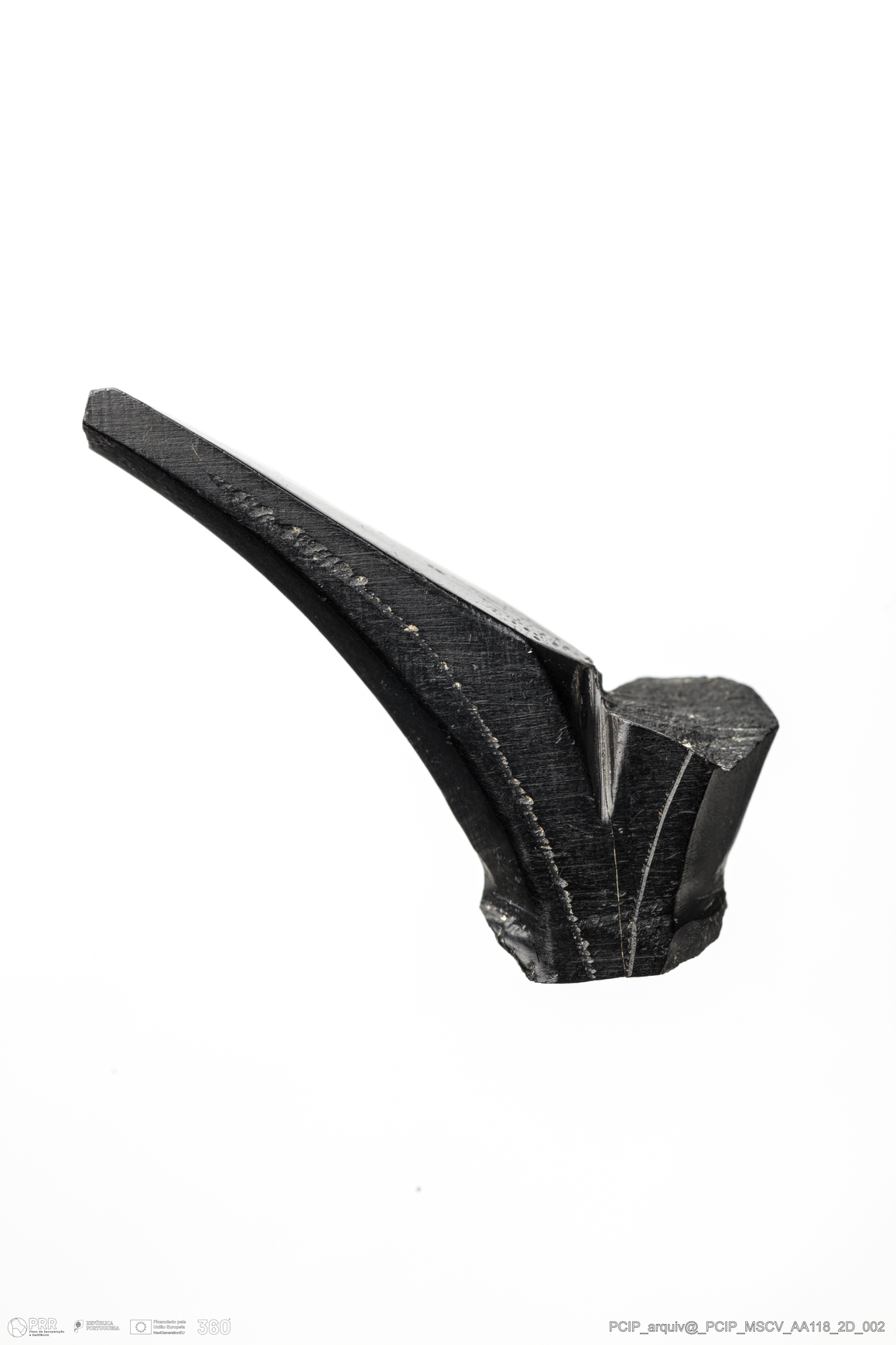 Matéria/Técnica: Azeviche; Cronologia: Século XVI- XVII; Autoria: Desconhecida; Dimensões: Comprimento: 31mm; Largura: 24mm; Espessura: 6mm.