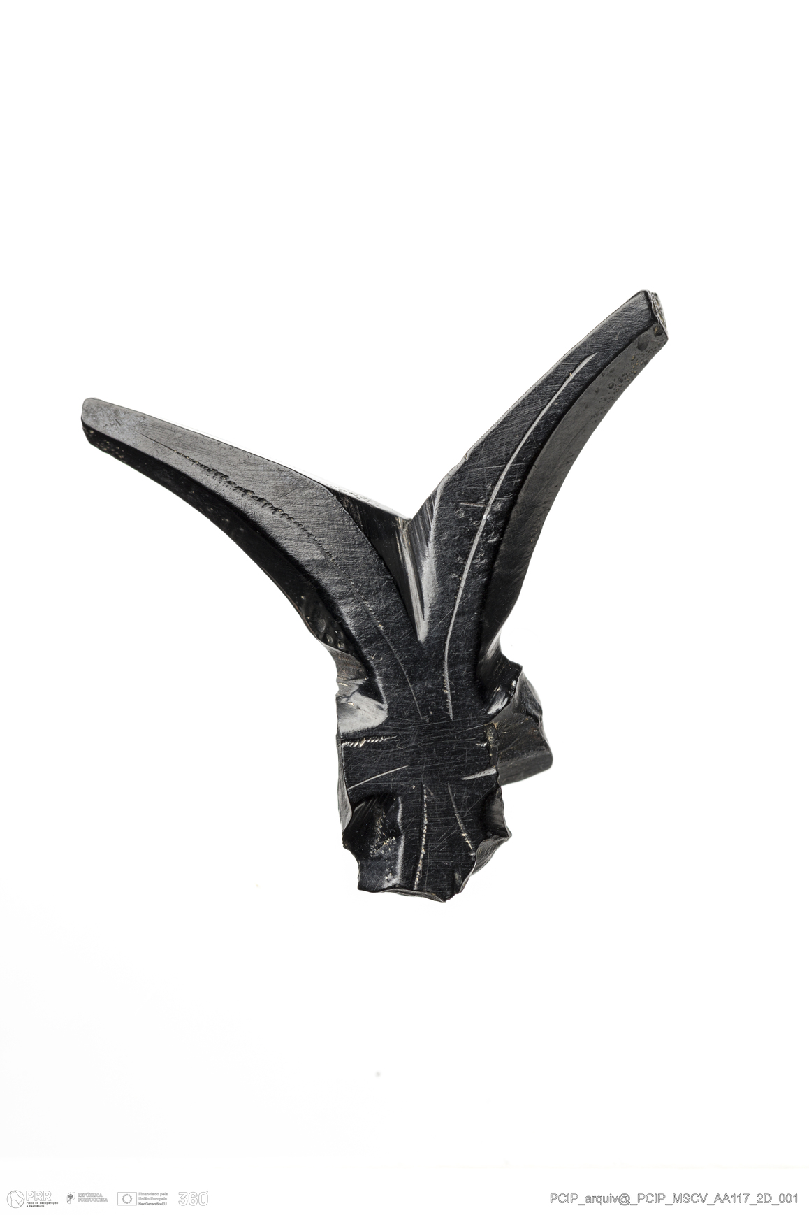 Matéria/Técnica: Azeviche; Cronologia: Século XVI- XVII; Autoria: Desconhecida; Dimensões: Comprimento: 31mm; Largura: 29mm; Espessura: 6mm.