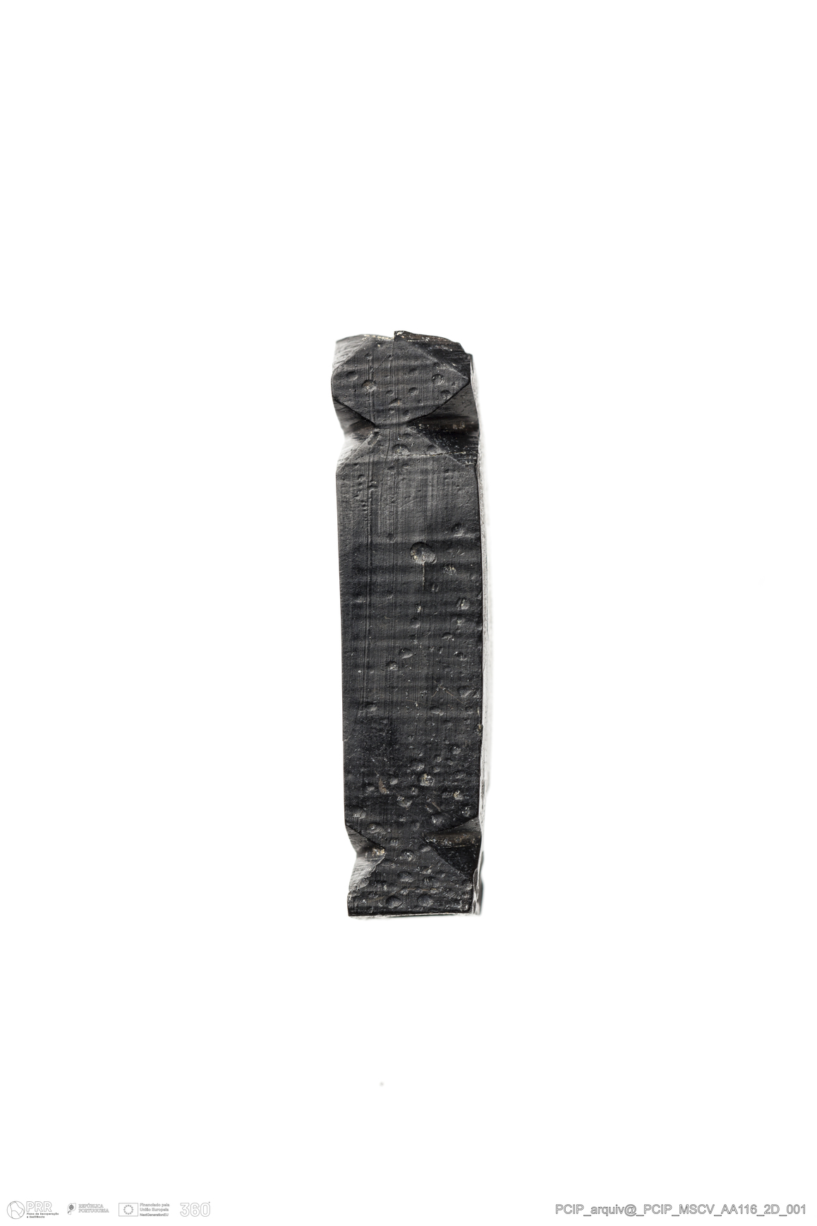 Matéria/Técnica: Azeviche; Cronologia: Século XVI- XVII; Autoria: Desconhecida; Dimensões: Comprimento: 23mm; Largura: 7mm; Espessura: 6mm.
