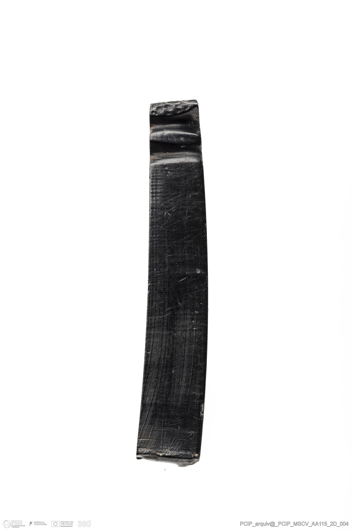Matéria/Técnica: Azeviche; Cronologia: Século XVI- XVII; Autoria: Desconhecida; Dimensões: Comprimento: 33mm; Largura: 6mm; Espessura: 6mm.
