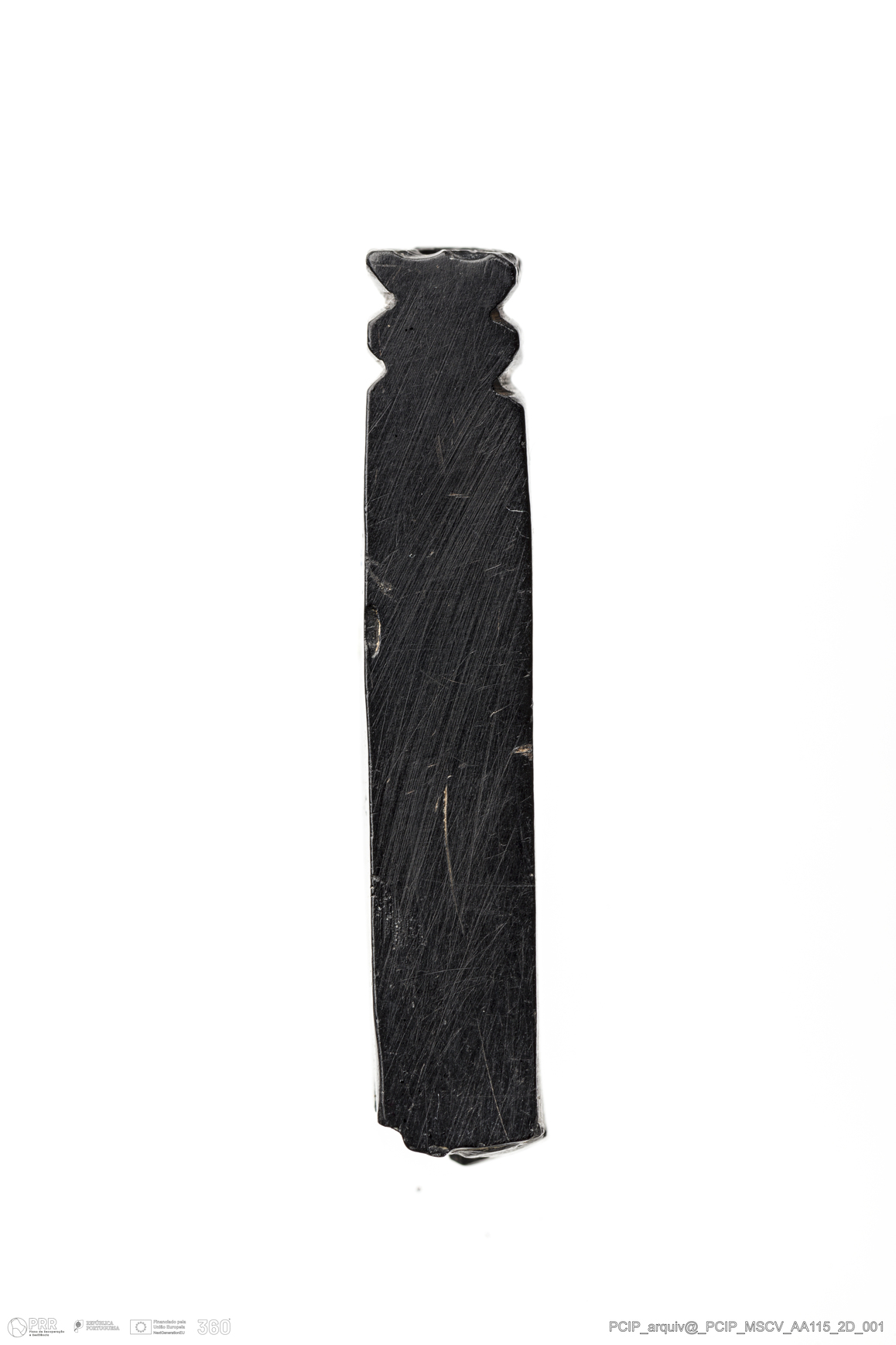 Matéria/Técnica: Azeviche; Cronologia: Século XVI- XVII; Autoria: Desconhecida; Dimensões: Comprimento: 33mm; Largura: 6mm; Espessura: 6mm.