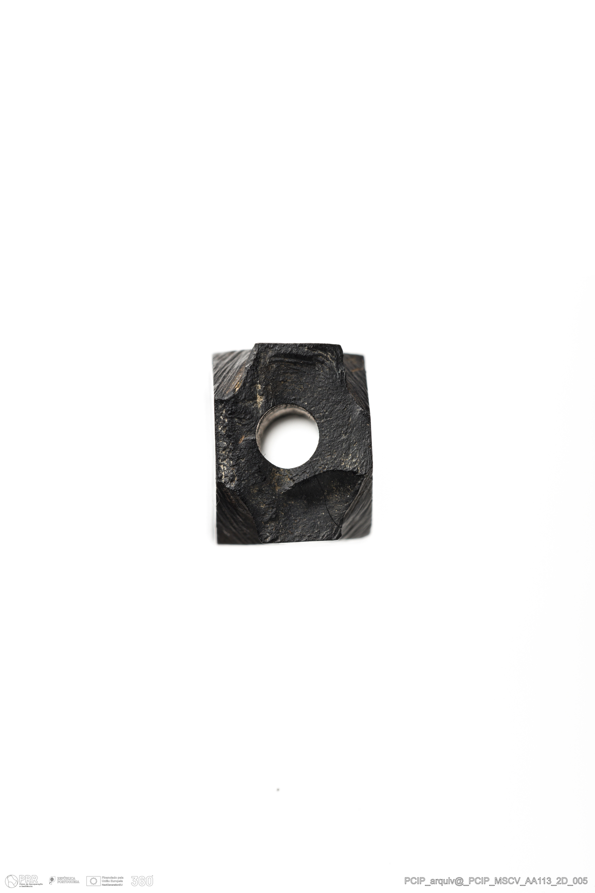 Matéria/Técnica: Azeviche; Cronologia: Século XVI- XVII; Autoria: Desconhecida; Dimensões: Comprimento: 12mm; Largura: 8mm; Espessura: 6mm.