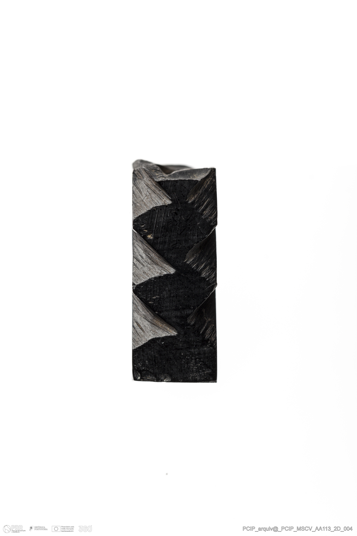 Matéria/Técnica: Azeviche; Cronologia: Século XVI- XVII; Autoria: Desconhecida; Dimensões: Comprimento: 12mm; Largura: 8mm; Espessura: 6mm.