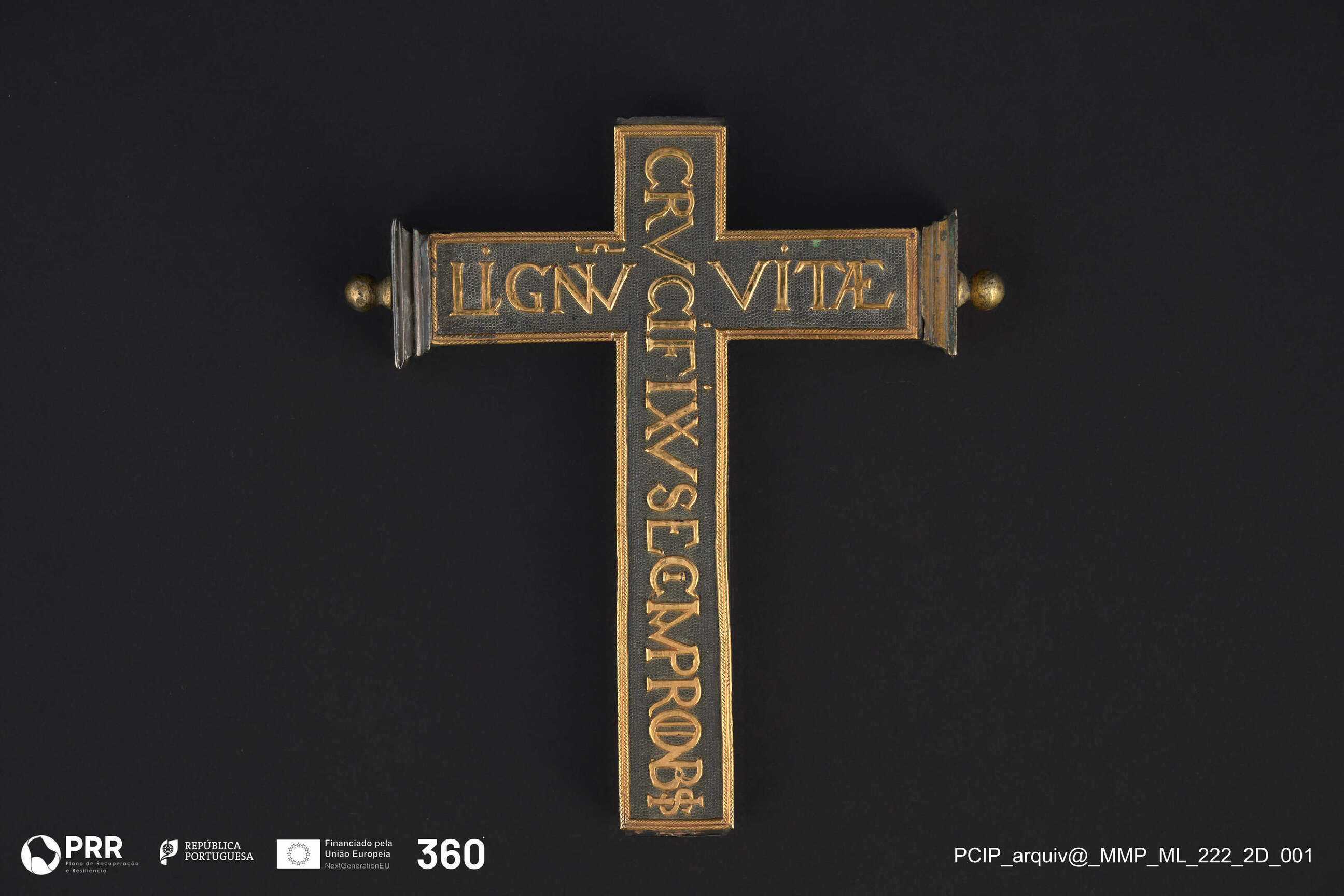 Matéria/Técnica: Dourada, incisa, relevada e esmaltada; Cronologia: Século XVIII; Autoria: Desconhecida; Dimensões (cm): Altura: 10 x Largura: 9,4 x Profundidade: 1,1.