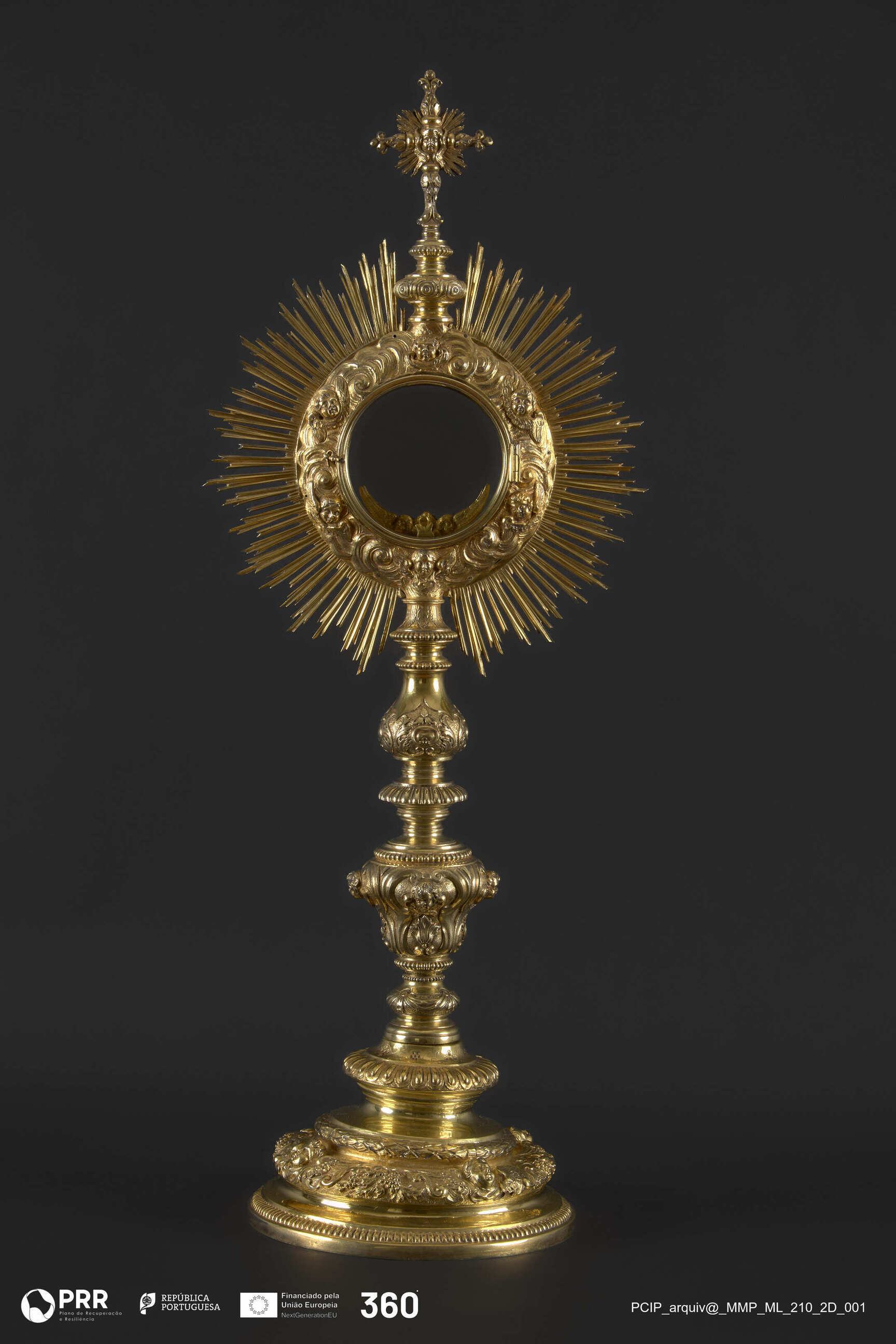 Matéria/Técnica: Prata dourada, relevada, incisa e recortada; Cronologia: 1701-1750; Autoria: MF(?) (não identificado); Dimensões (cm): Altura: 75 x Largura: 29 x Diâmetro: base: 21,5.