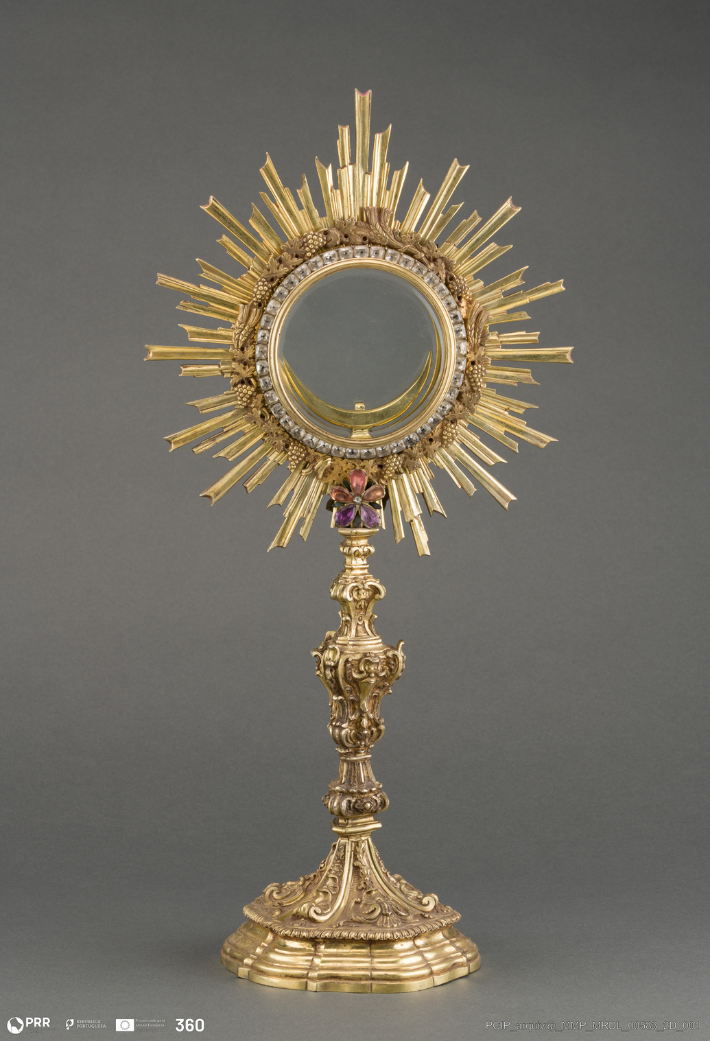 Matéria/Técnica: Prata Dourada, Minas Novas e Gemas; Cronologia: Desconhecida; Autoria: Desconhecida; Dimensões: Altura: 45,60 cm; Diâmetro: 13,93 cm; Peso: 1.957,00 gr.