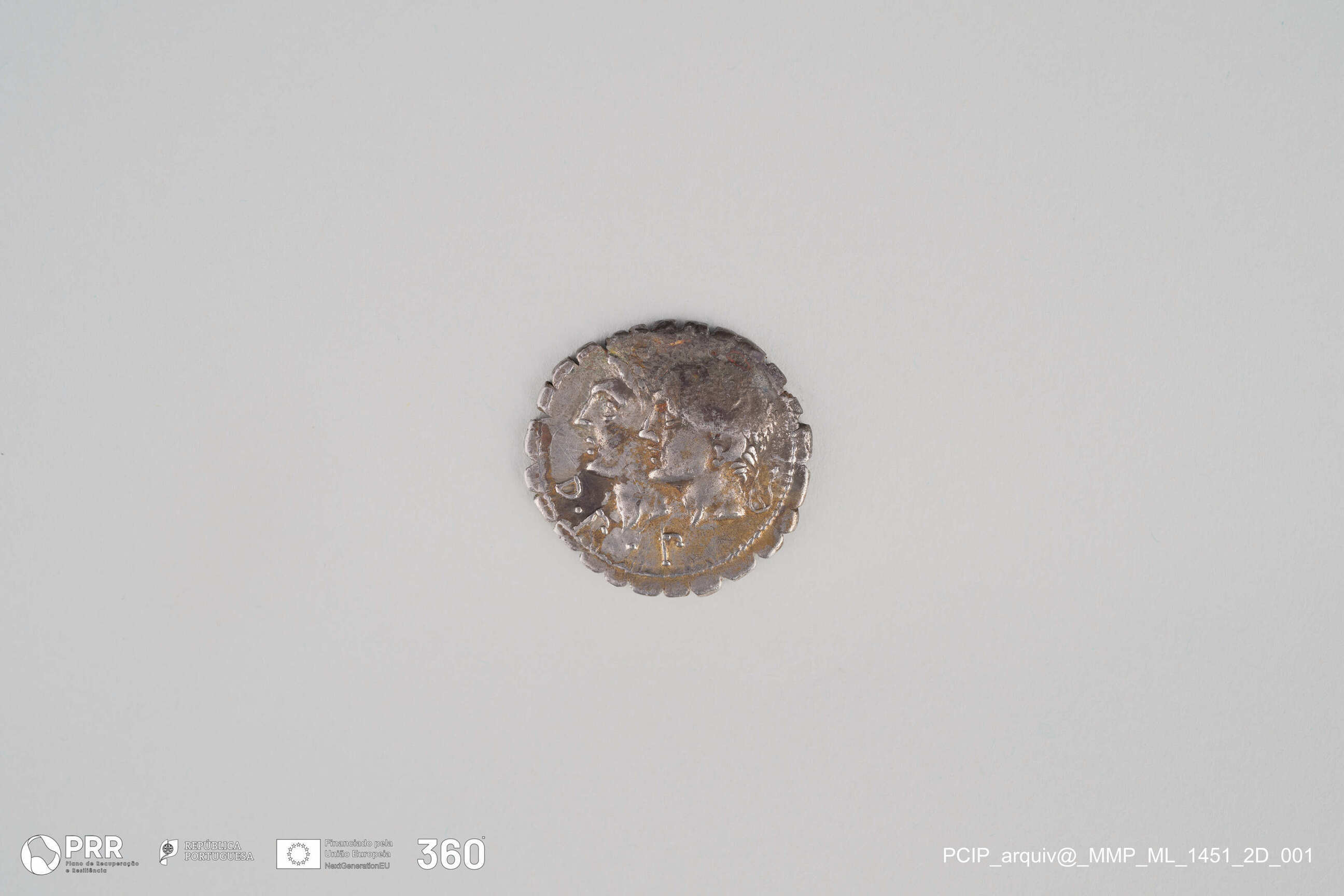 Matéria/Técnica: Cunhagem; Cronologia: 106 a.C.; Autoria: Desconhecida; Dimensões (cm): Diâmetro: 1,8.