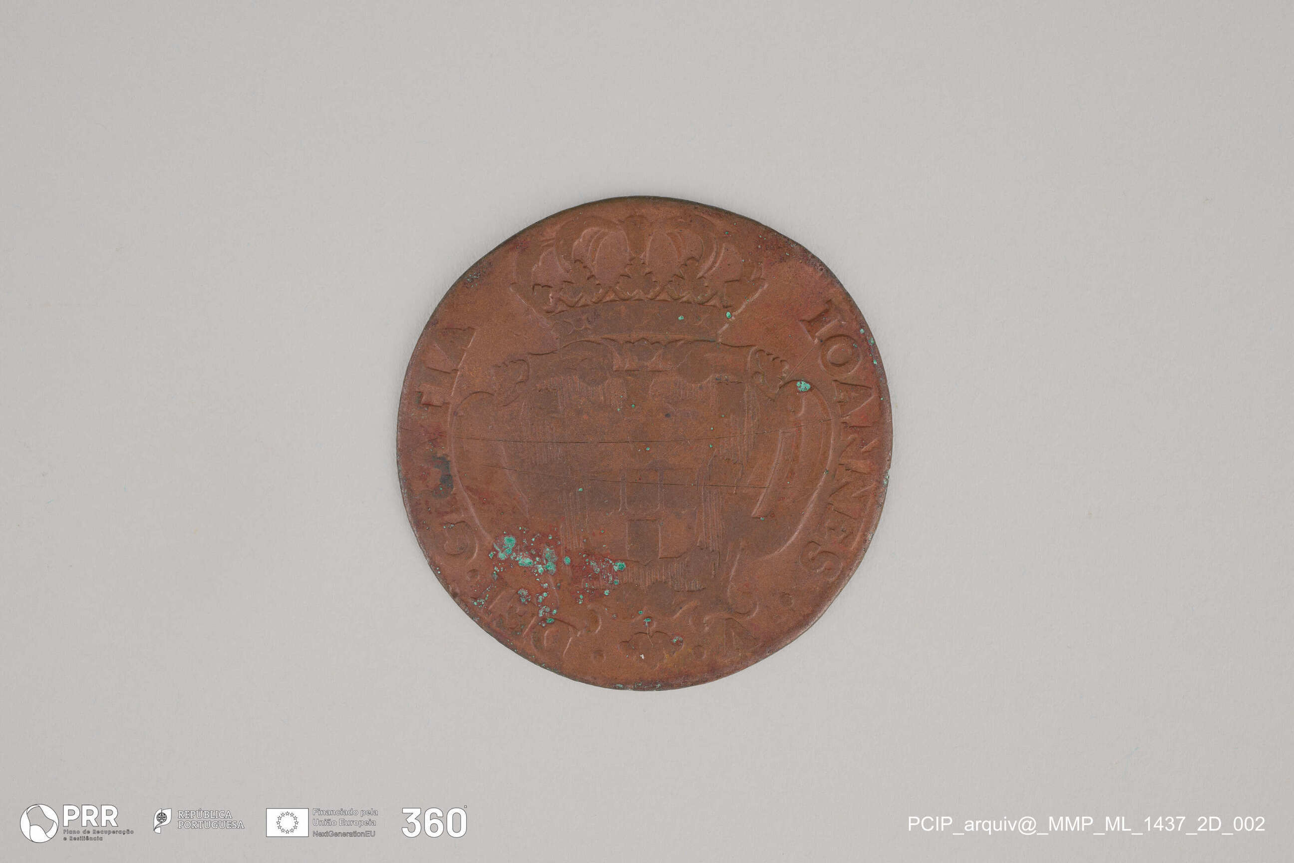 Matéria/Técnica: Cunhagem; Cronologia: 1734; Autoria: Desconhecida; Dimensões (cm): Diâmetro: 3,6.