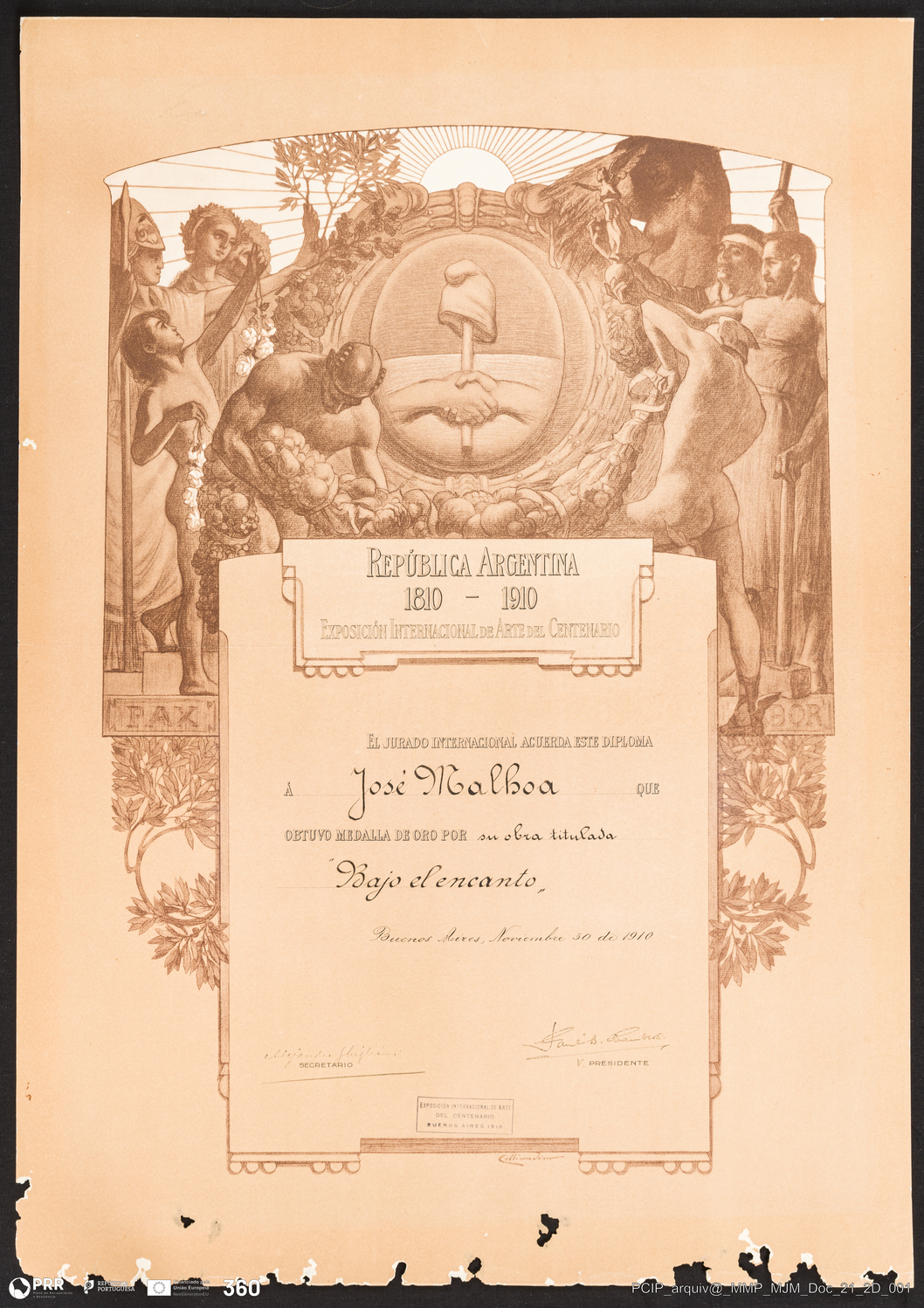 Diploma. Exposición Internacional Del Arte Del Centenario, República Argentina. Medalla de Oro