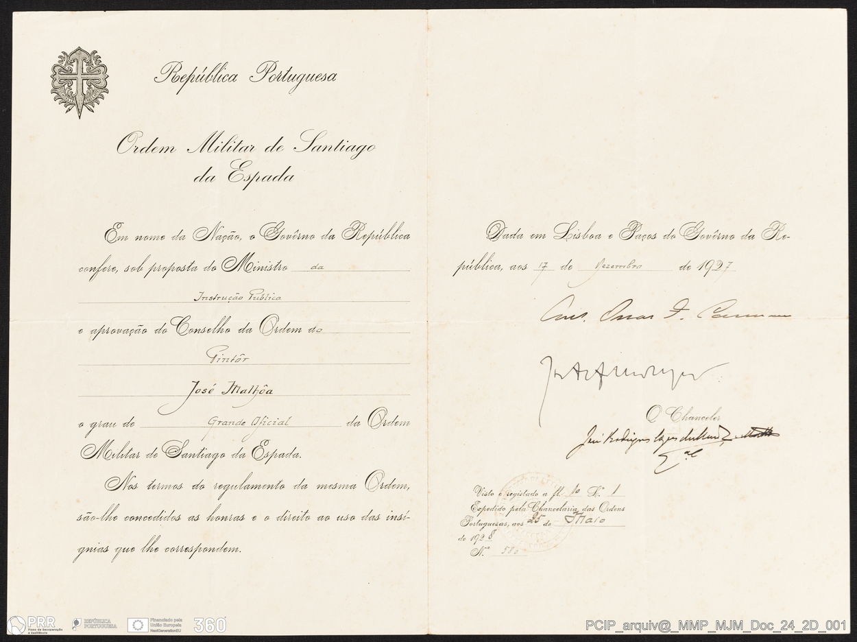 Documento simples. MJM_Doc_24_2D_001 - Diploma. V Exposição das Caldas da Rainha. Prémio de Honra