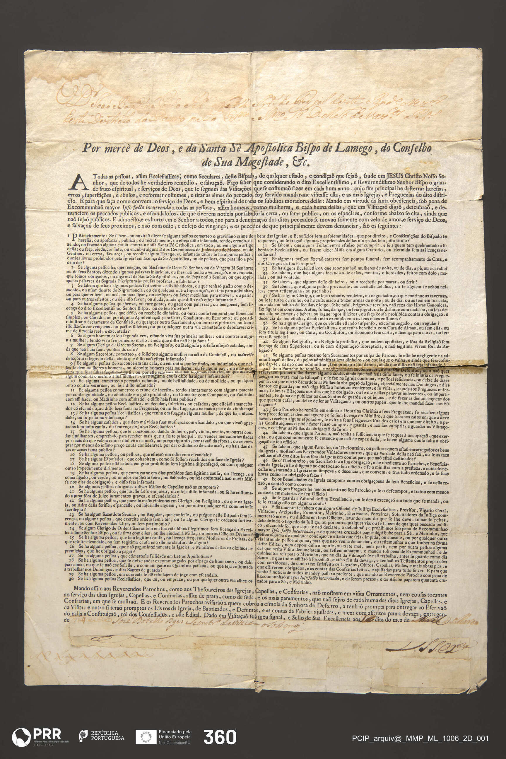 Matéria/Técnica: Impressão; Cronologia: 1784; Autoria: Nossa Senhora, D. Frey Feliciano de - Bispo de Lamego; Dimensões (cm): Altura: 58,1 x Largura: 41,4.