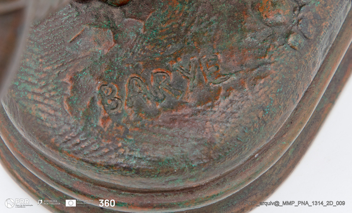 Matéria/Técnica: Bronze; Cronologia: Século XIX; Autoria: Barye, Antoine-Louis (1795-1875); Dimensões (cm): Altura: 13,5; Largura: 20; Profundidade: 9,5.