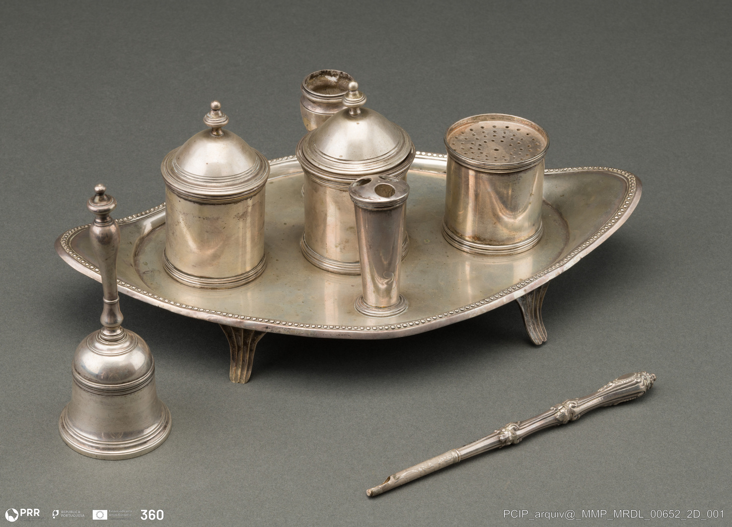 Matéria/Técnica: Prata; Cronologia: Desconhecida; Autoria: Desconhecida; Dimensões: Altura: 4,10 cm; Largura: 16,20 cm; Comprimento: 27,70 cm; Peso: 257,80 gr.