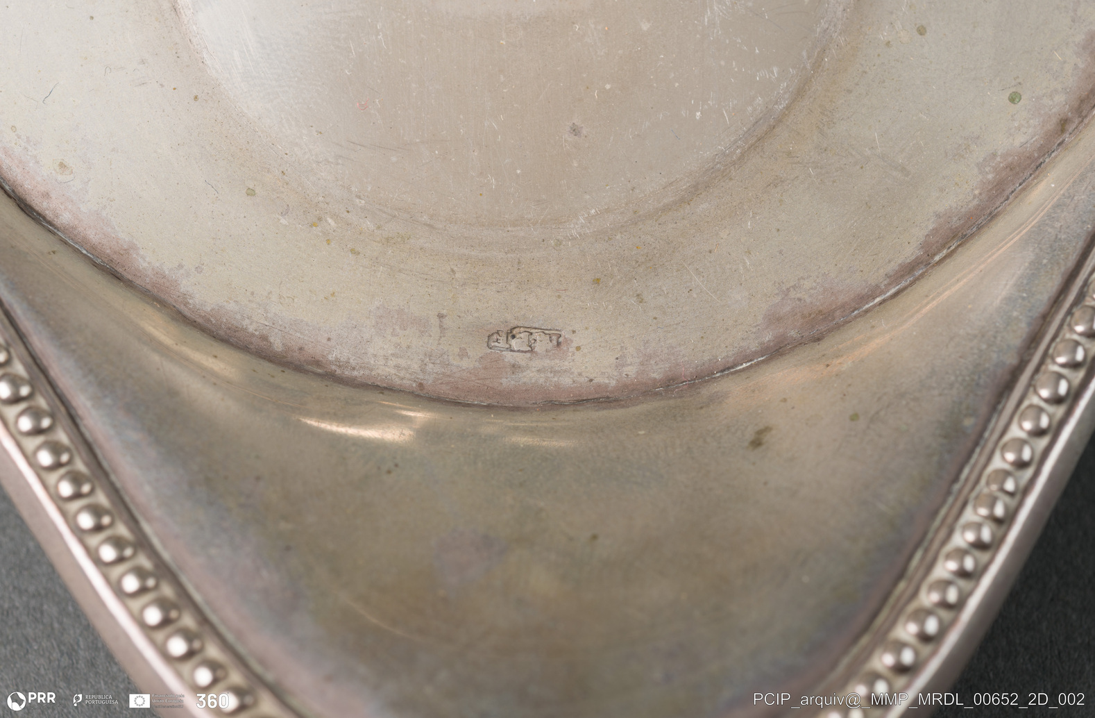 Matéria/Técnica: Prata; Cronologia: Desconhecida; Autoria: Desconhecida; Dimensões: Altura: 4,10 cm; Largura: 16,20 cm; Comprimento: 27,70 cm; Peso: 257,80 gr.
