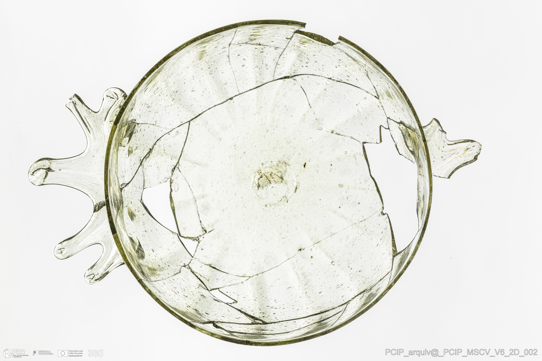 Matéria/Técnica: Vidro; Cronologia: Século XVII; Autoria: Desconhecida; Dimensões: Altura: 45mm; Diâmetro máximo: 95mm.