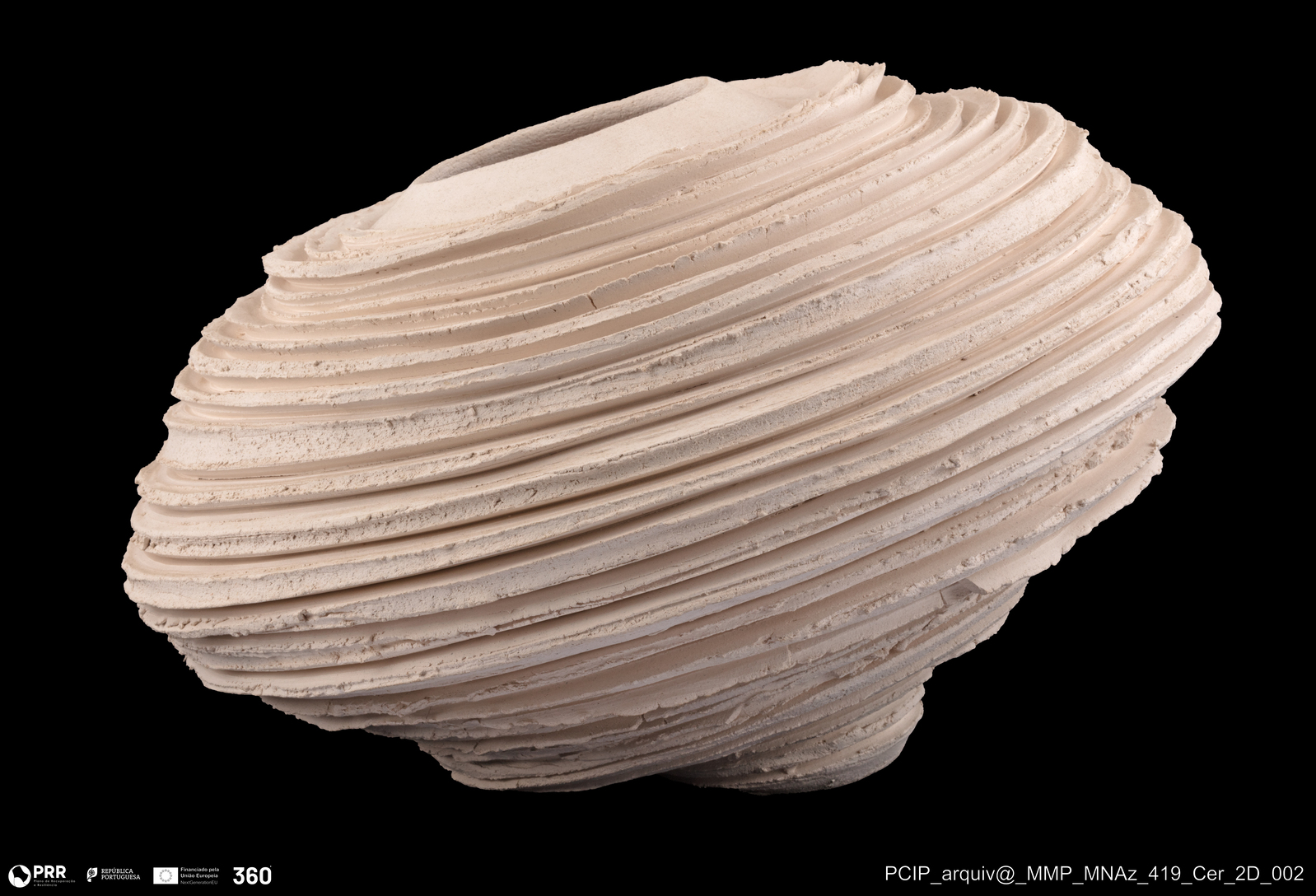Matéria/ Técnica: Grés e vidrado; Cronologia: 2003; Autoria: Abrantes, Helena; Dimensões (cm): Altura: 25 cm; Largura: 37,5 cm; Profundidade: 38 cm; Diâmetro: 11 cm.