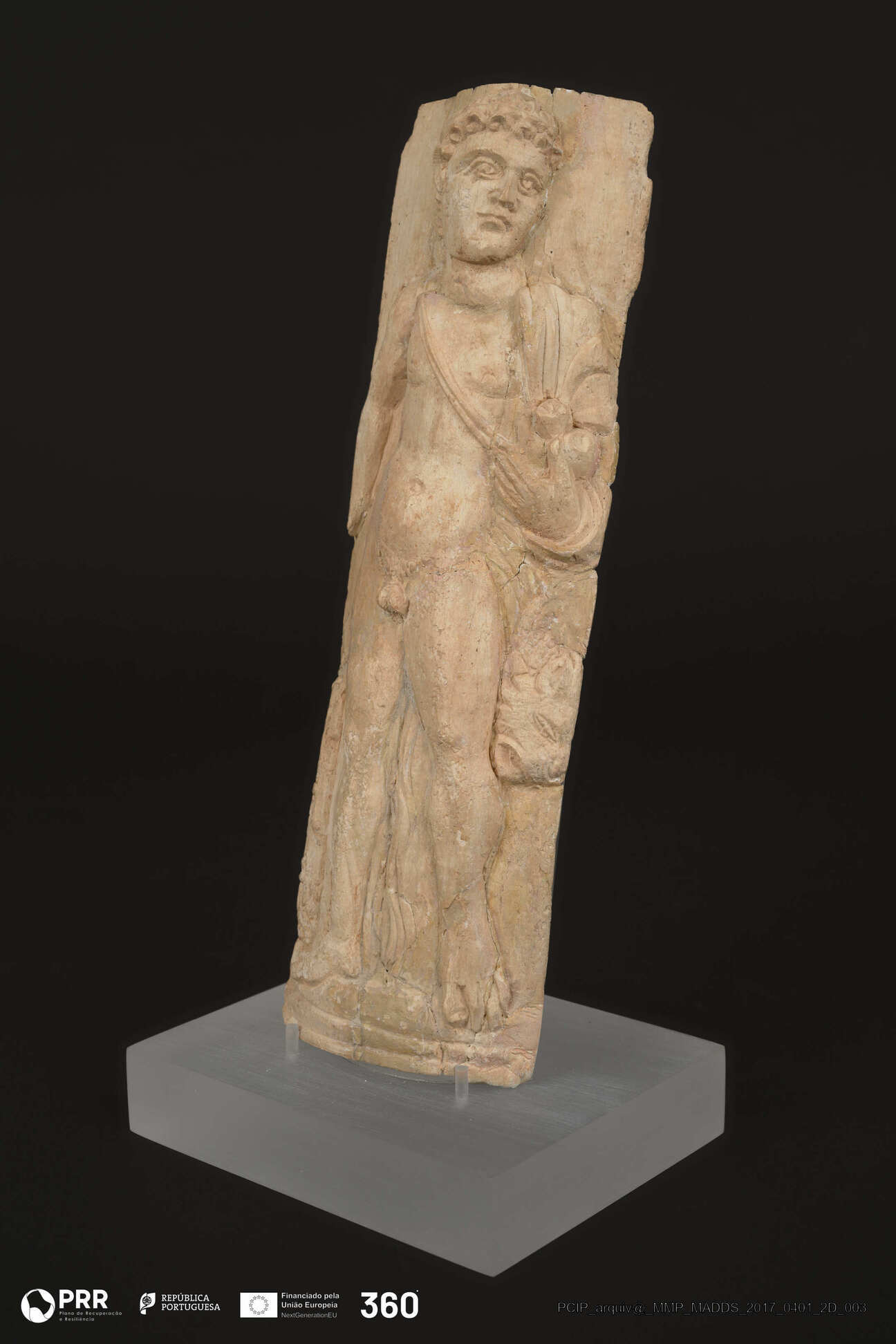 Matéria/Técnica: Marfim; Cronologia: Romano; Autoria: Desconhecida; Dimensões (cm): 21 x 7 x 3.