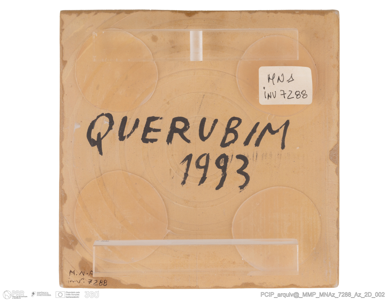 Matéria/Técnica: Faiança Relevo com reflexos metálicos; Cronologia: 1993; Autoria: Lapa, Querubim (Portimão, 1925 - Lisboa, 2016); Dimensões: Altura: 14 cm x Largura: 14 cm x Espessura: 2 cm.