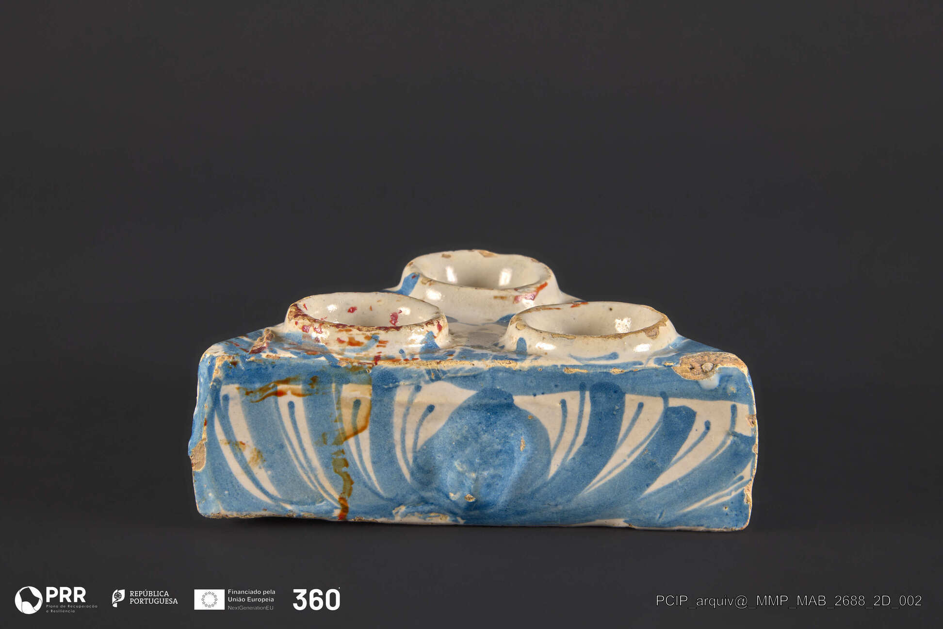 Matéria/Técnica: Peça moldada, vidrada, pintada a azul sobre fundo branco; Cronologia: Desconhecida; Autoria: Desconhecida; Dimensões: Desconhecidas.