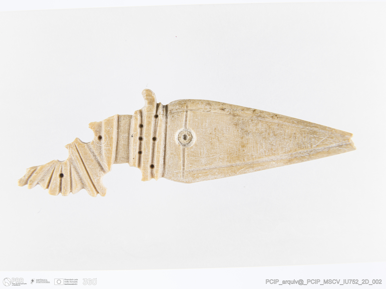 Matéria/Técnica: Osso; Cronologia: Século XVII; Autoria: Desconhecida; Dimensões: Comprimento: 63mm; Largura: 18mm; Espessura: 2mm.