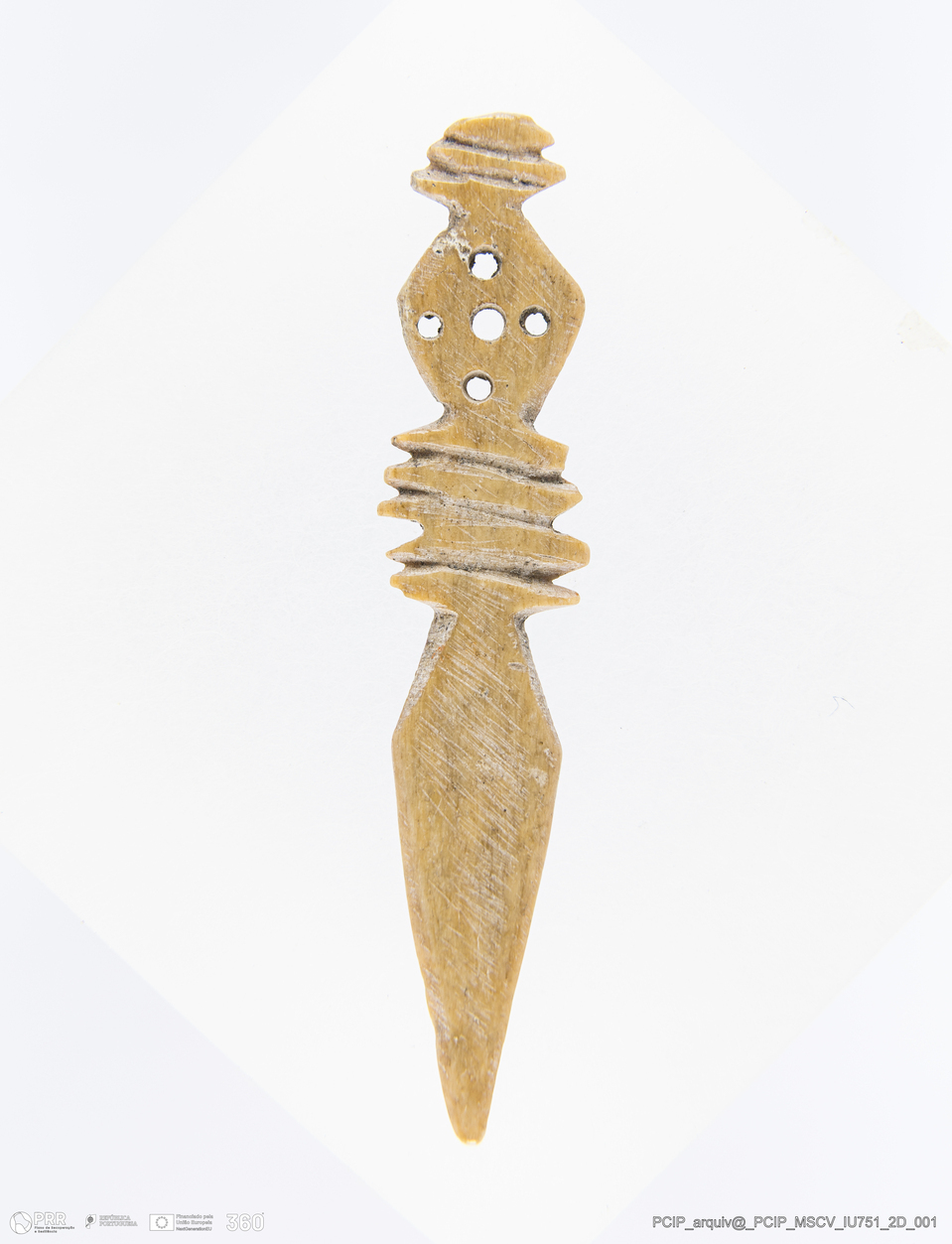 Matéria/Técnica: Osso; Cronologia: Século XVII; Autoria: Desconhecida; Dimensões: comprimento: 50mm; Largura: 10mm; Espessura: 2mm.